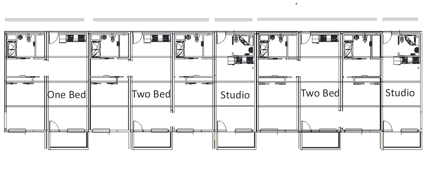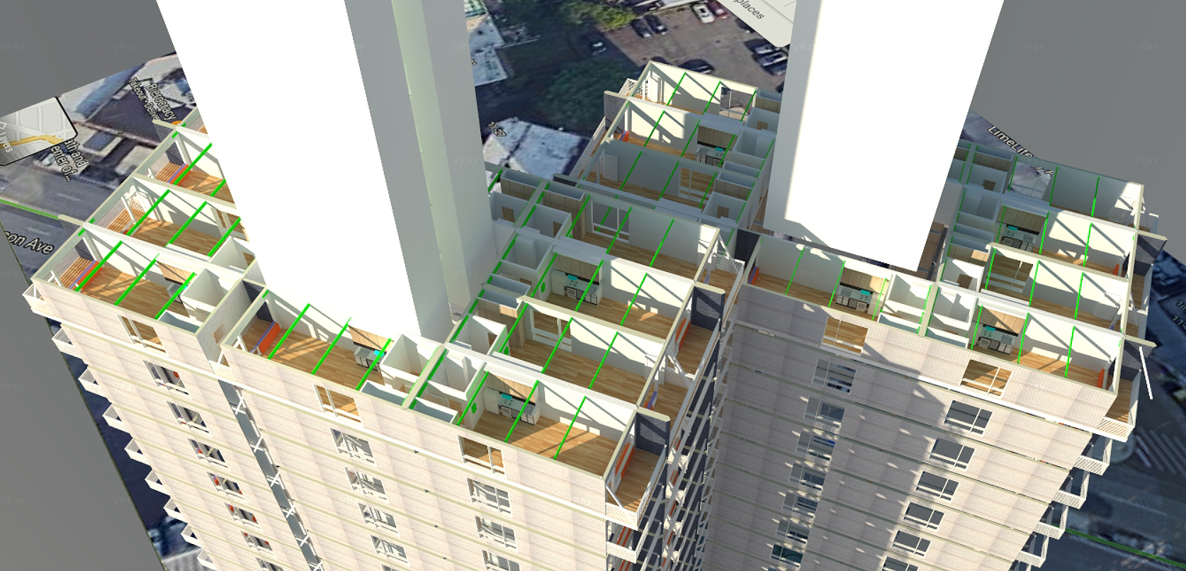 • Volumetric involves enclosures which can operate as structural systems, extending up to 40 stories using steel framing inside the volumetric units, and up to 5 stories with wood framing inside the volumetric units.