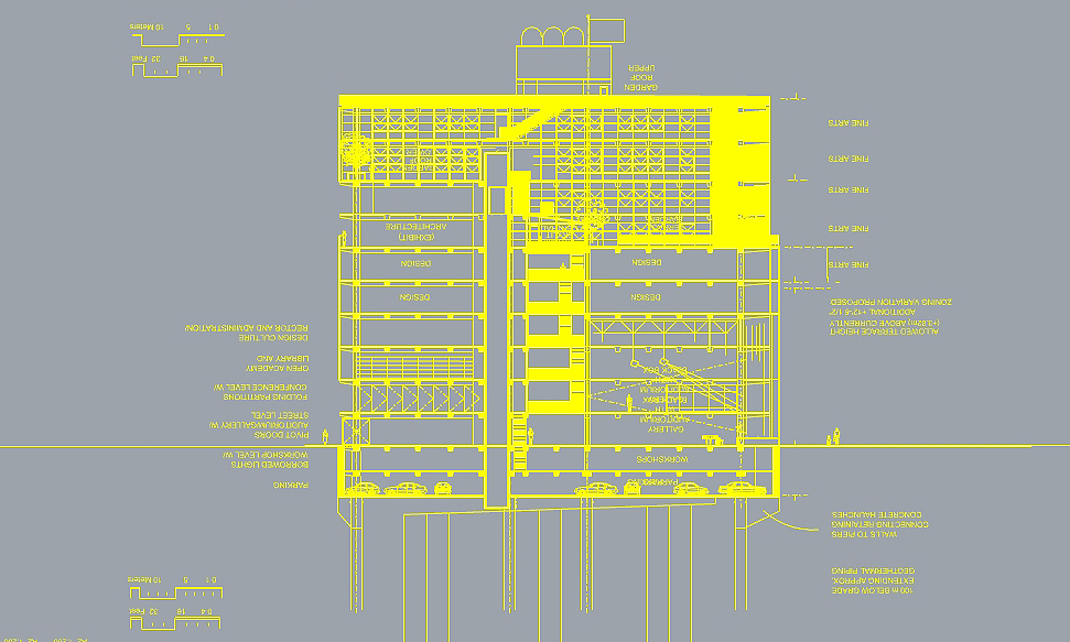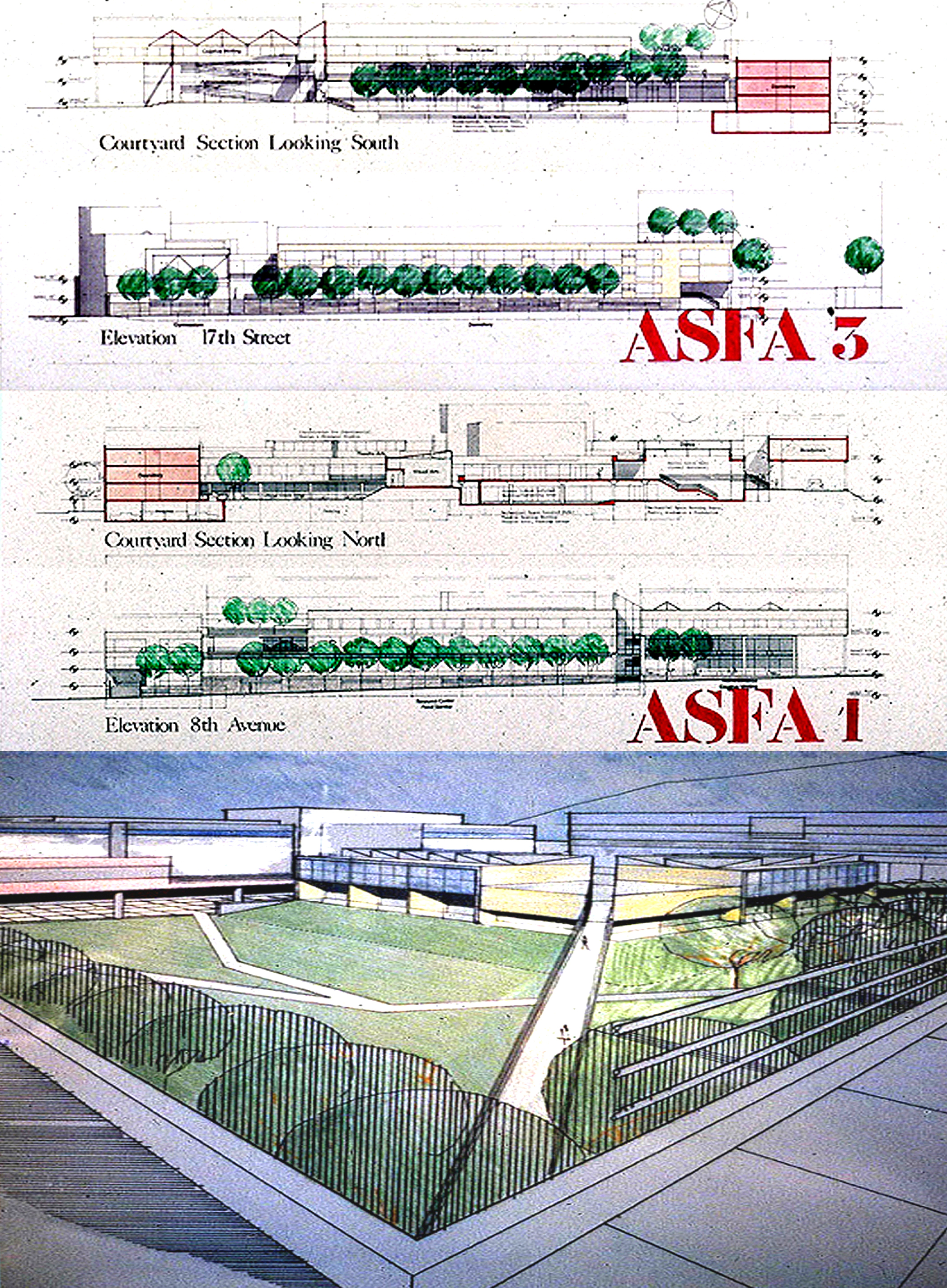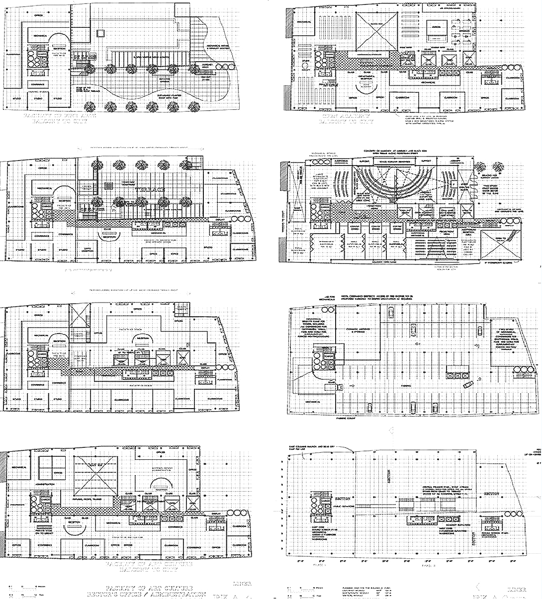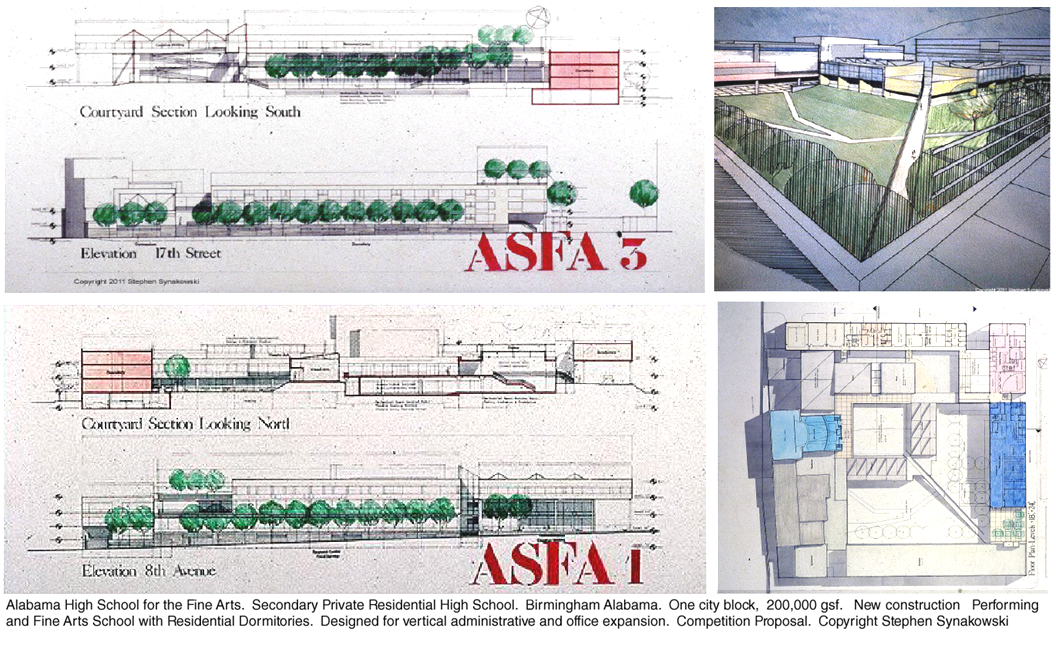 ASFA | Alabama High School for the Fine Arts. Birmingham, AL. Private Urban high school for the Fine and Lively Arts. Dormitories, library, Painting, Sculpture and Architecture Studios, Theaters, Classrooms. Competition Proposal for New Construction. 1990. Establishing and validating the relation of Art and Media to the Urban Community.;