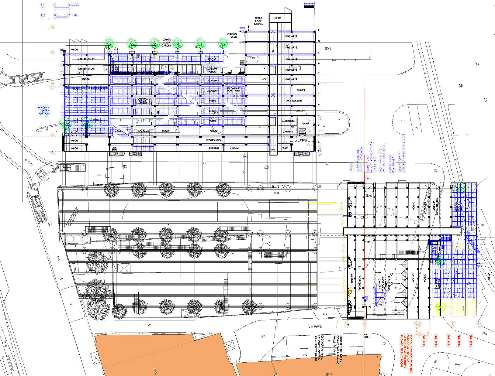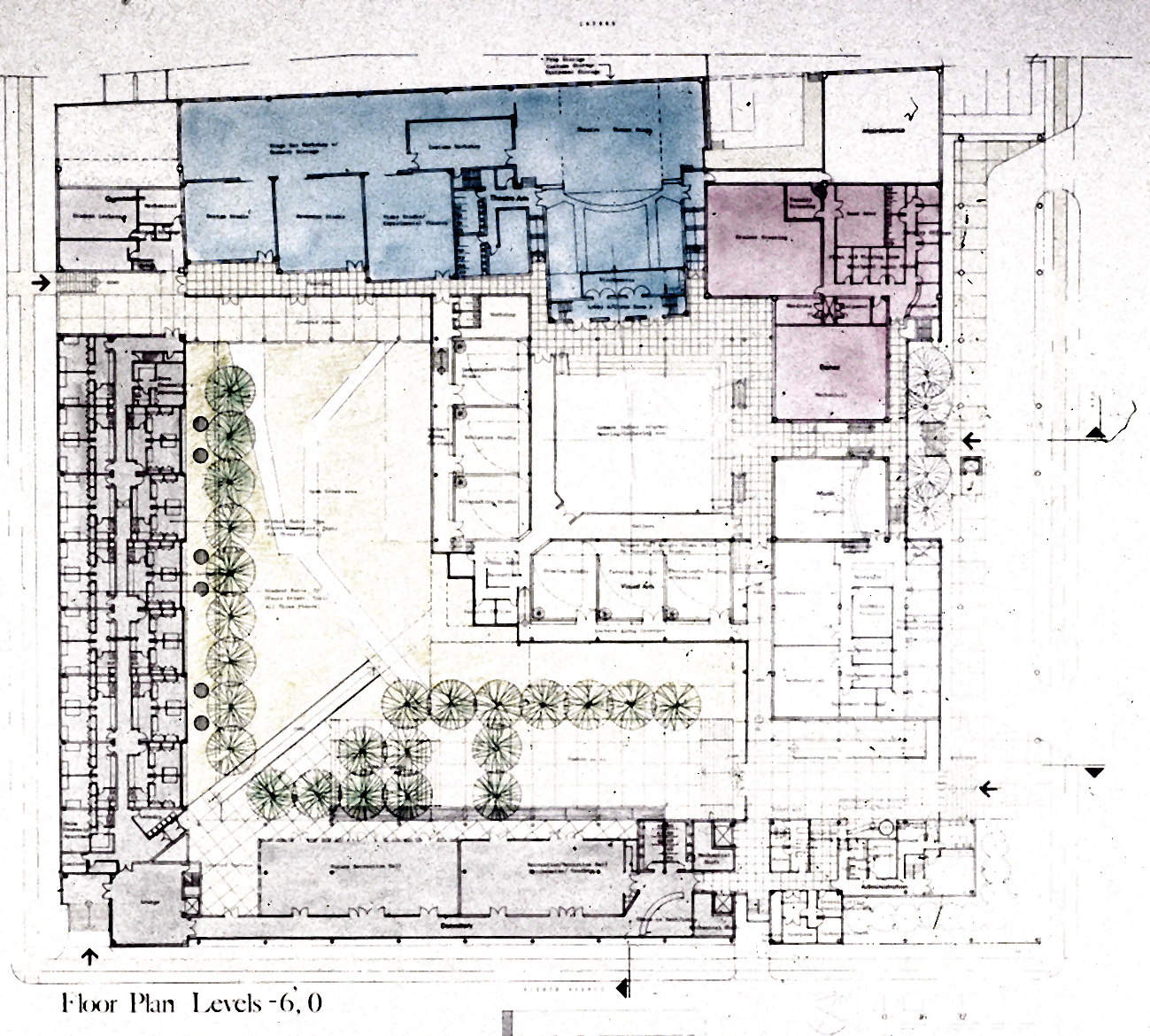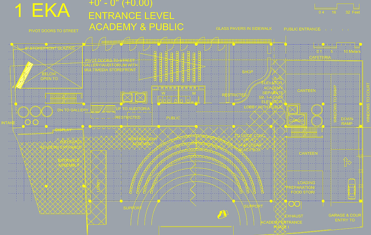 ASFA | Alabama High School for the Fine Arts. Birmingham, AL. Private Urban high school for the Fine and Lively Arts. Dormitories, library, Painting, Sculpture and Architecture Studios, Theaters, Classrooms. Competition Proposal for New Construction. 1990. Establishing and validating the relation of Art and Media to the Urban Community.;