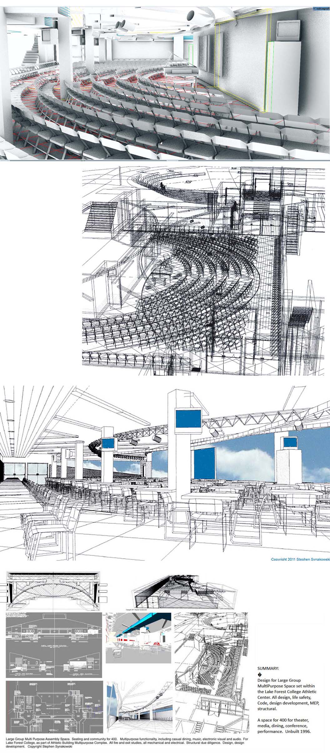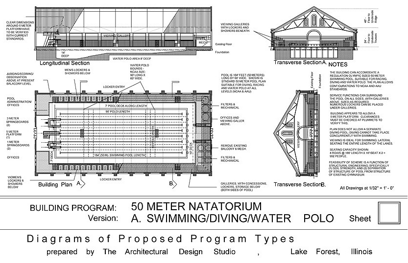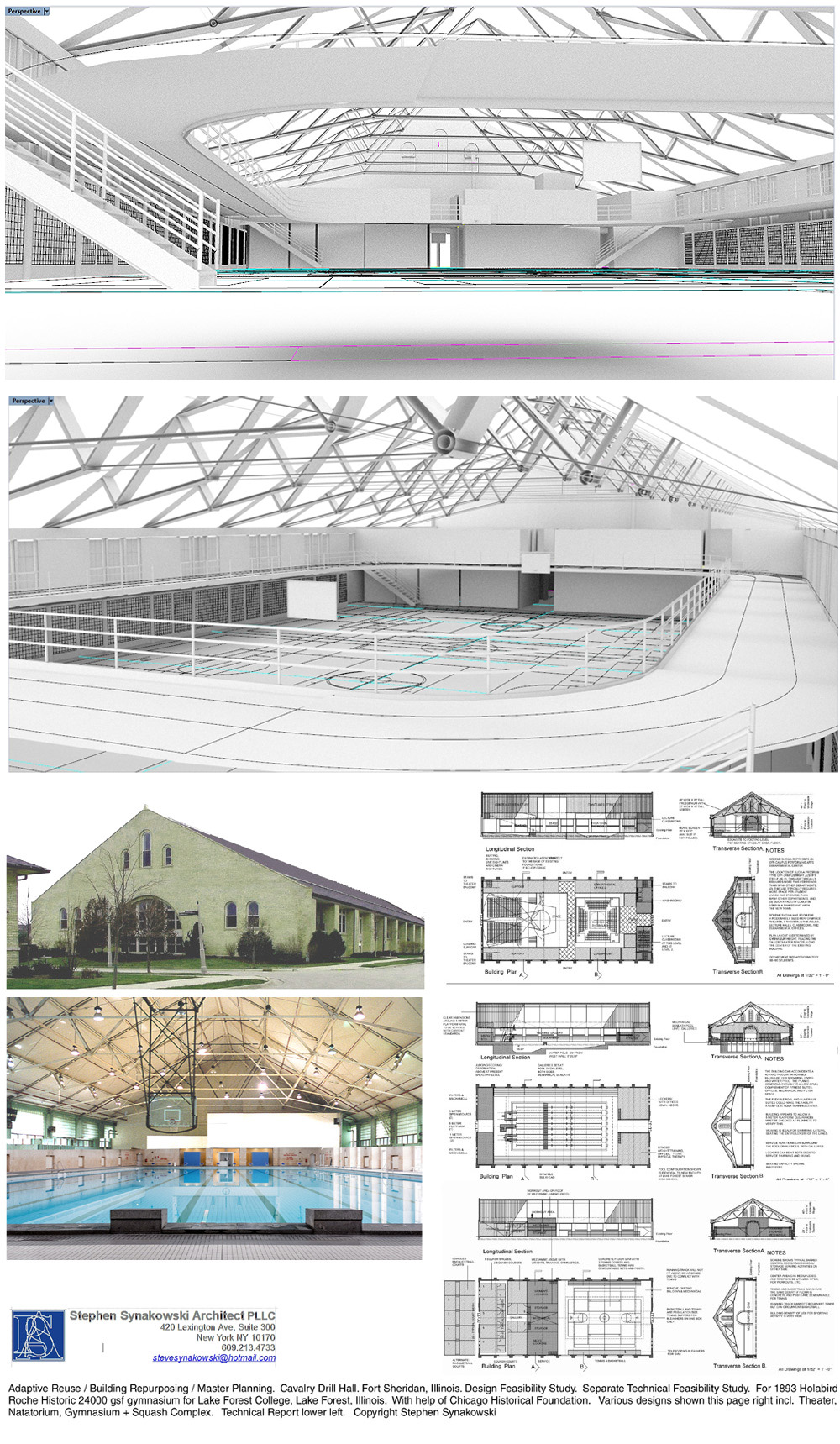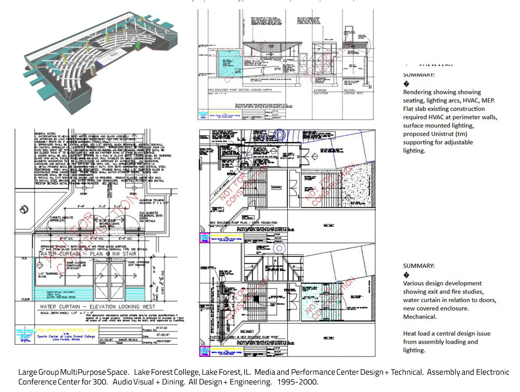Interiors Designs Studies for Use of 24,000 gsf Gymnasium. Culture, Assembly, Sports Events. for Lake Forest College, Lake Forest, IL. Commissioned Design. 1997. Feasibility and Technical Studies for a variety of collegiate uses of large intact institutional building. Use studies ranged from large scale Athletic, including Fitness Center and Olympic Pool, to Collegiate Indoor Assembly and Theater, University Resources Center. Media and messaging in relation to Building Repurposing, intersection of traditional architectural languages with contemporary design programming and needs.