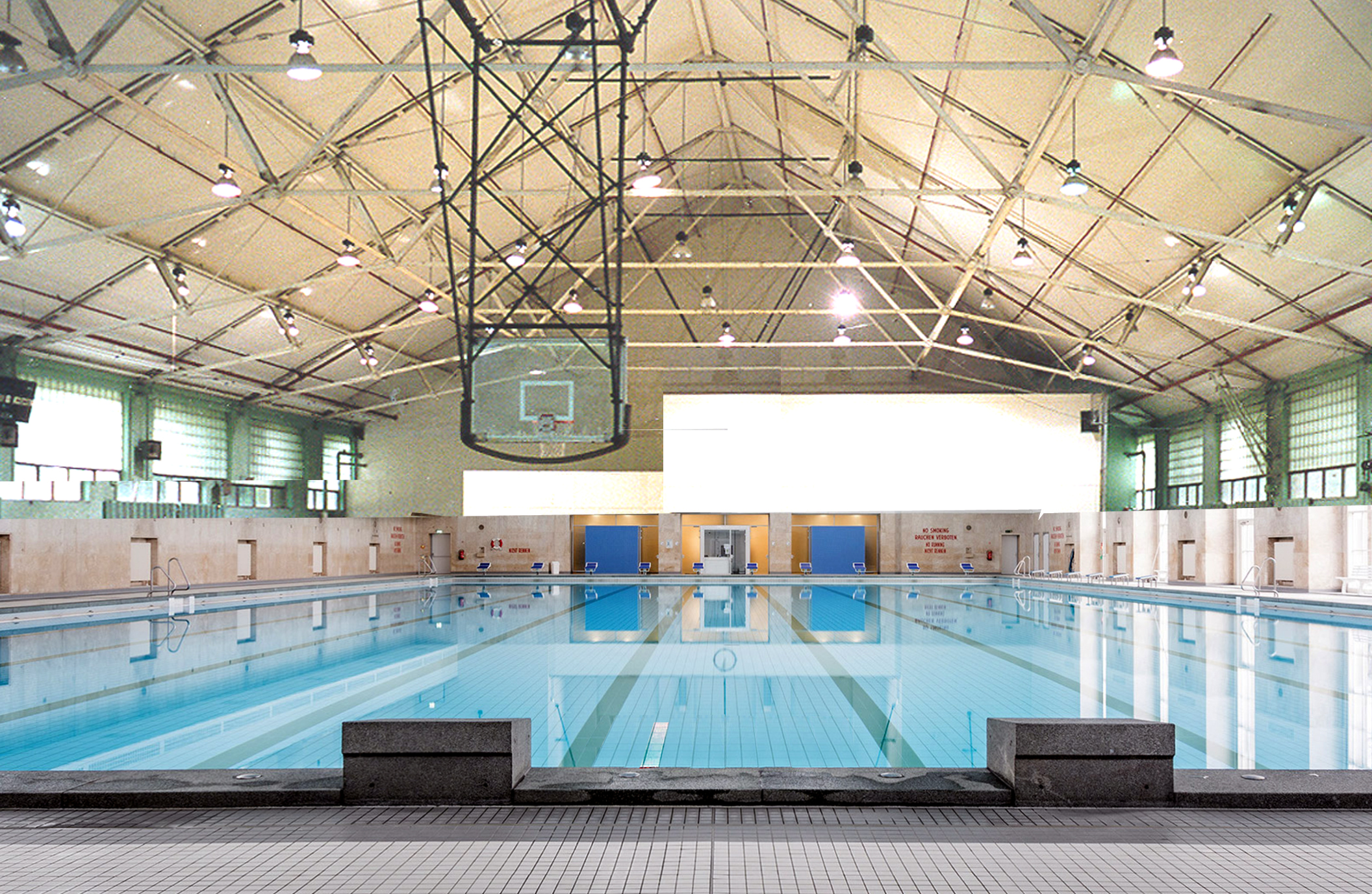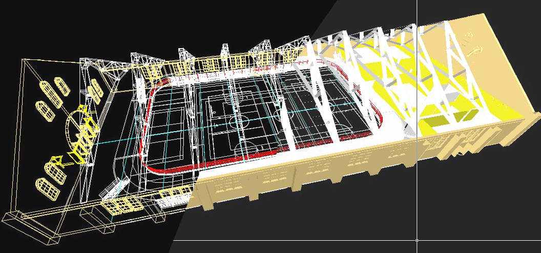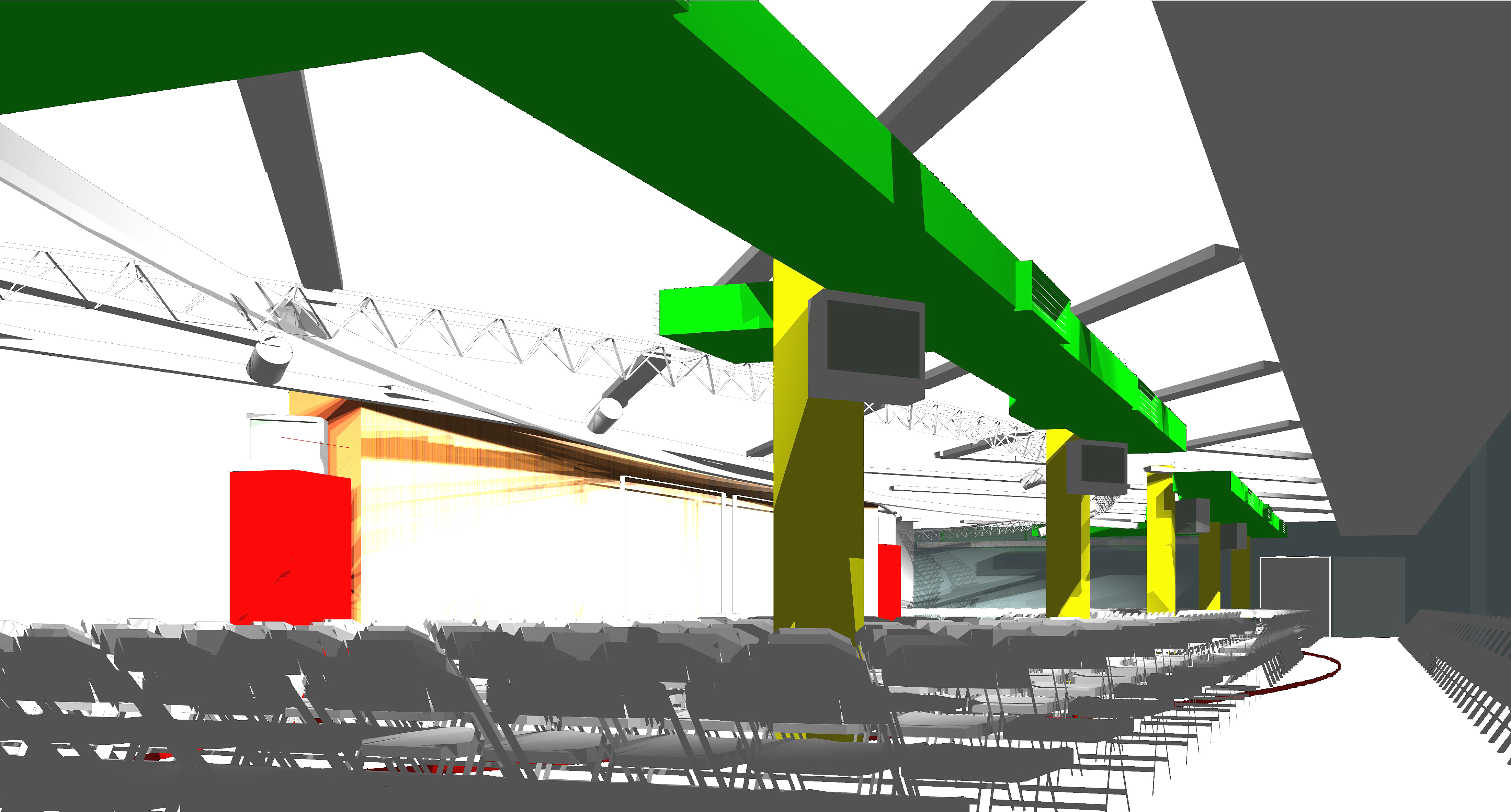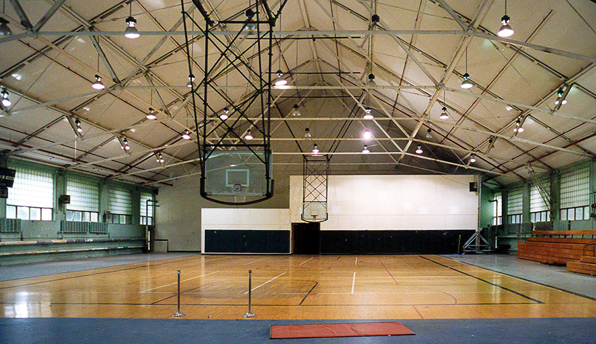 Interiors Designs Studies for Use of 24,000 gsf Gymnasium. Culture, Assembly, Sports Events. for Lake Forest College, Lake Forest, IL. Commissioned Design. 1997. Feasibility and Technical Studies for a variety of collegiate uses of large intact institutional building. Use studies ranged from large scale Athletic, including Fitness Center and Olympic Pool, to Collegiate Indoor Assembly and Theater, University Resources Center. Media and messaging in relation to Building Repurposing, intersection of traditional architectural languages with contemporary design programming and needs.