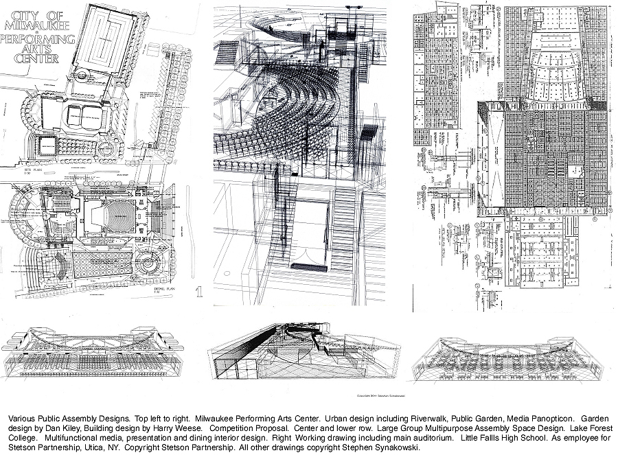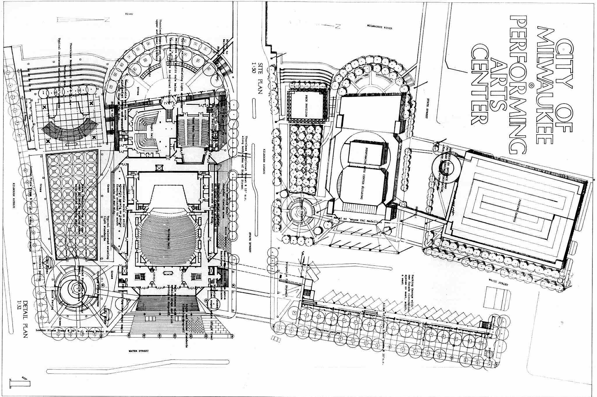 PAC | Performing Arts Center, Site Design incl. Exterior Media. Milwaukee, WI. Redesign of Urban Park to include Electronic Billboard in Building Aracade, LCD Urban Kiosk, Riverfront Reworked Dining Pavilion, Urban Landscape RiverFront Park. Design adjacent to Uhlein Symphony Concert Hall. Competition Proposal. Exterior Site and Media Design. 1990;