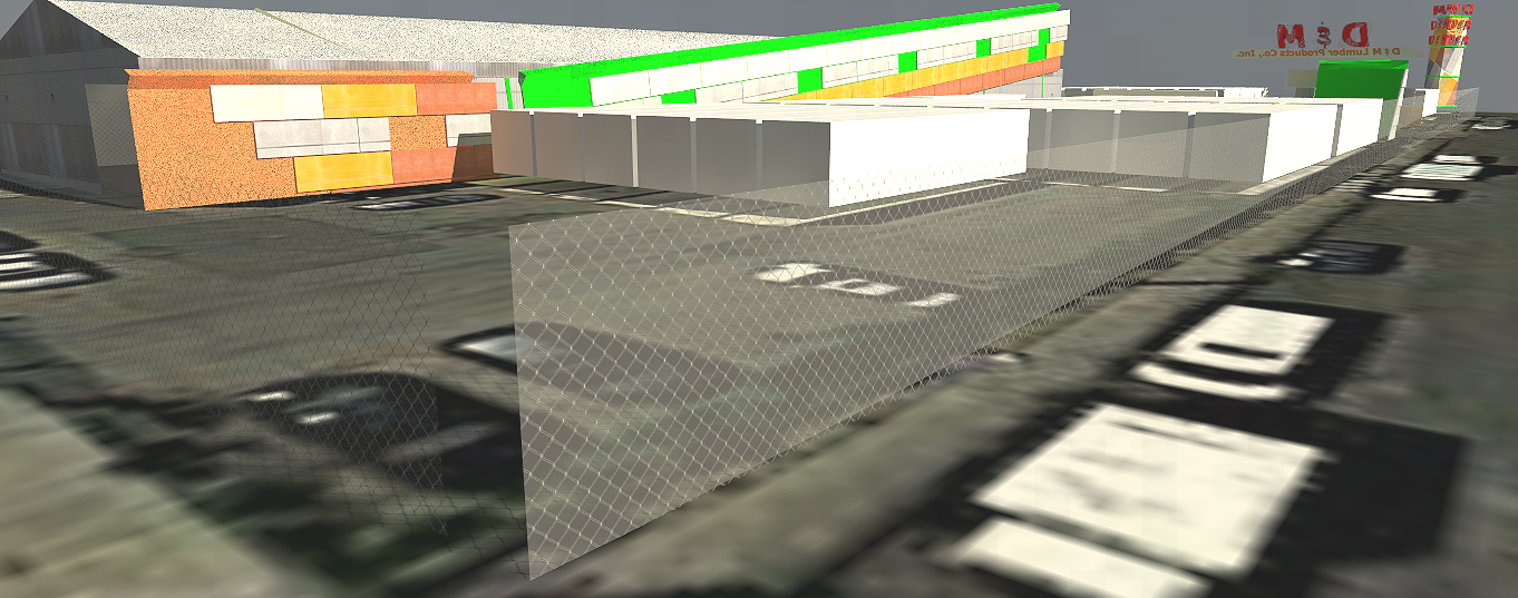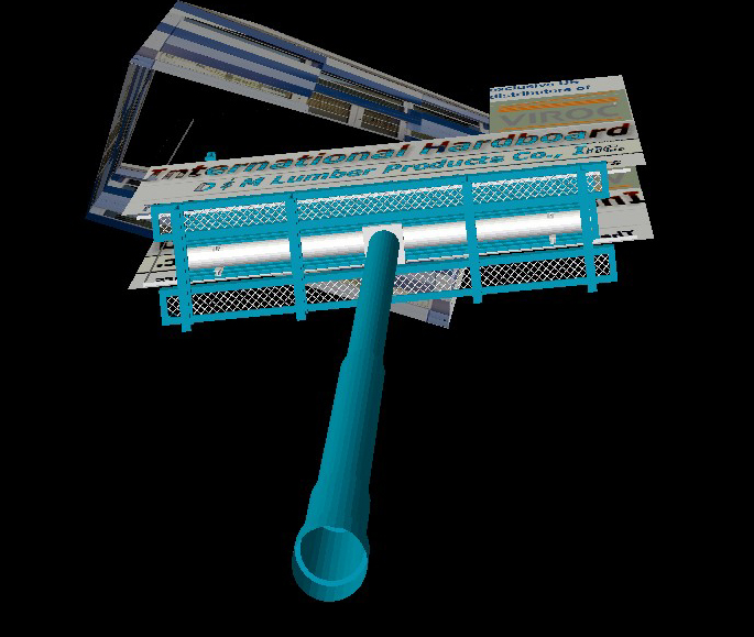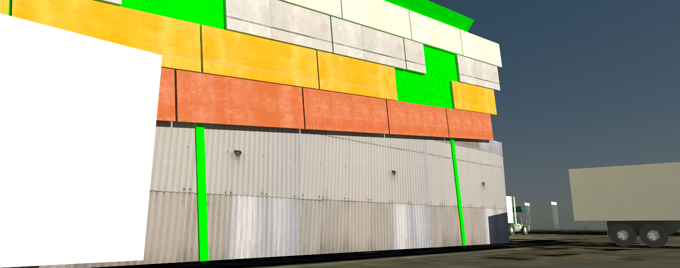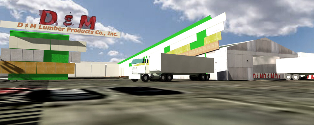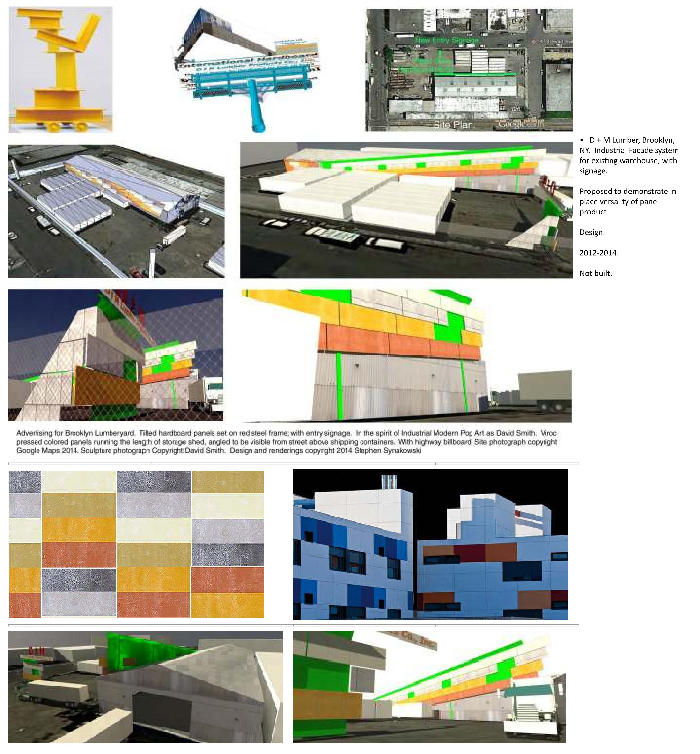 DM Building Products Company Design Proposal, Brooklyn, NY, 2012-3. Revisit and remagining of urban image and marketing potential of colored building products panel line to re-present and showcase new directions in building curtainwall to market products of existing NYC builing product distributor. Use of colored panel product as stop motion architectural element on the flank of main warehouse building to arrest attention. Linked outboard advertising constructions, at grade in the manner of David Smith, sculptor, and in a traditional raised corner billboard, designed as a collage..