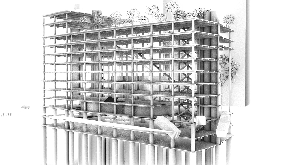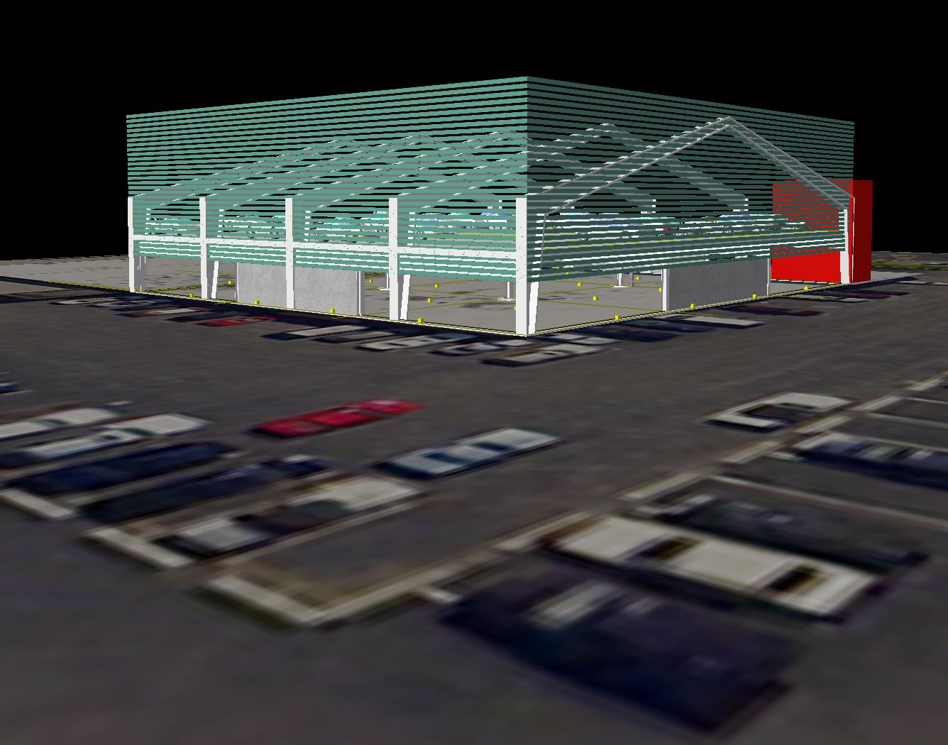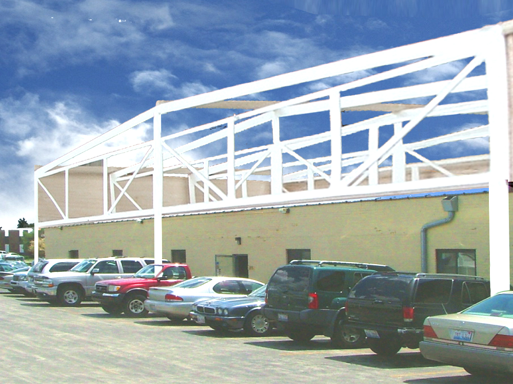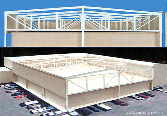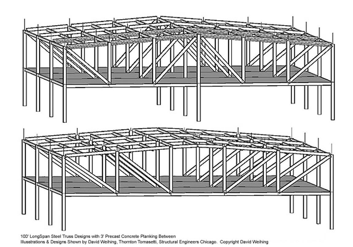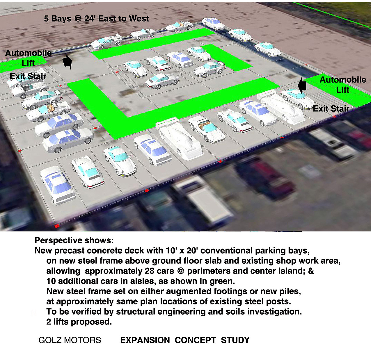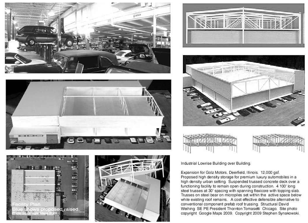 Golz Motors. Building over Building. Deerfield, Illinois. 2008-10. Cost and Space efficient architectural proposal to exploit capital potential of site, by expanding current luxury automobile enterprise up and over former masonry printing plant. Separate custom 100' spanning warrent truss designs, designed by Thornton Tomasetti SE, Chicago. bearing precast hollow core concrete planking to bear 40 automobiles. Alternate structural studies with simple fixed moment framing.