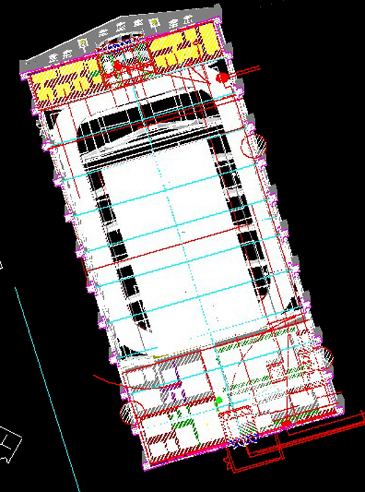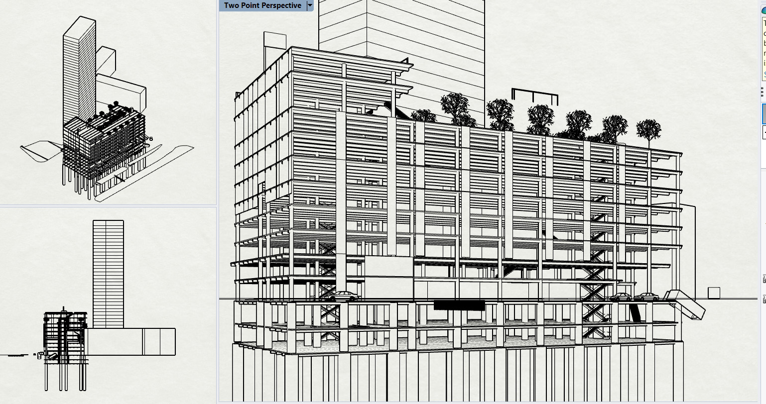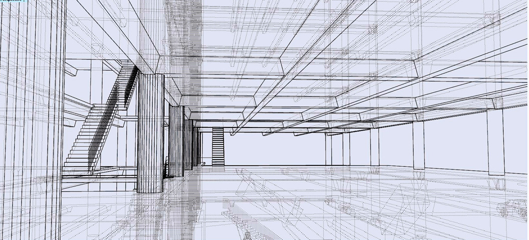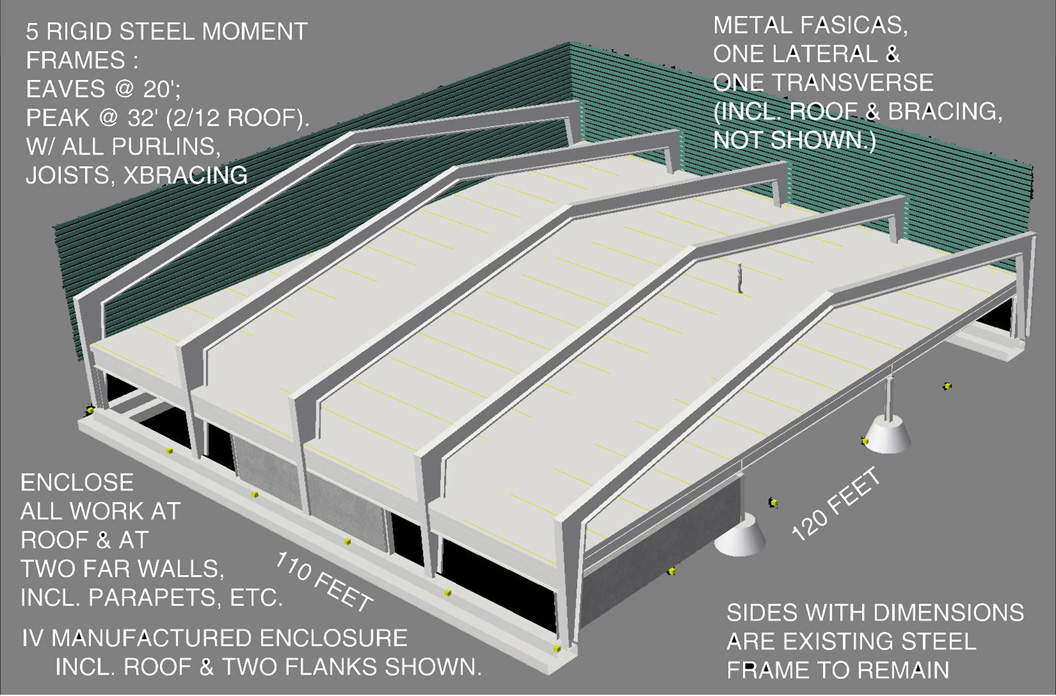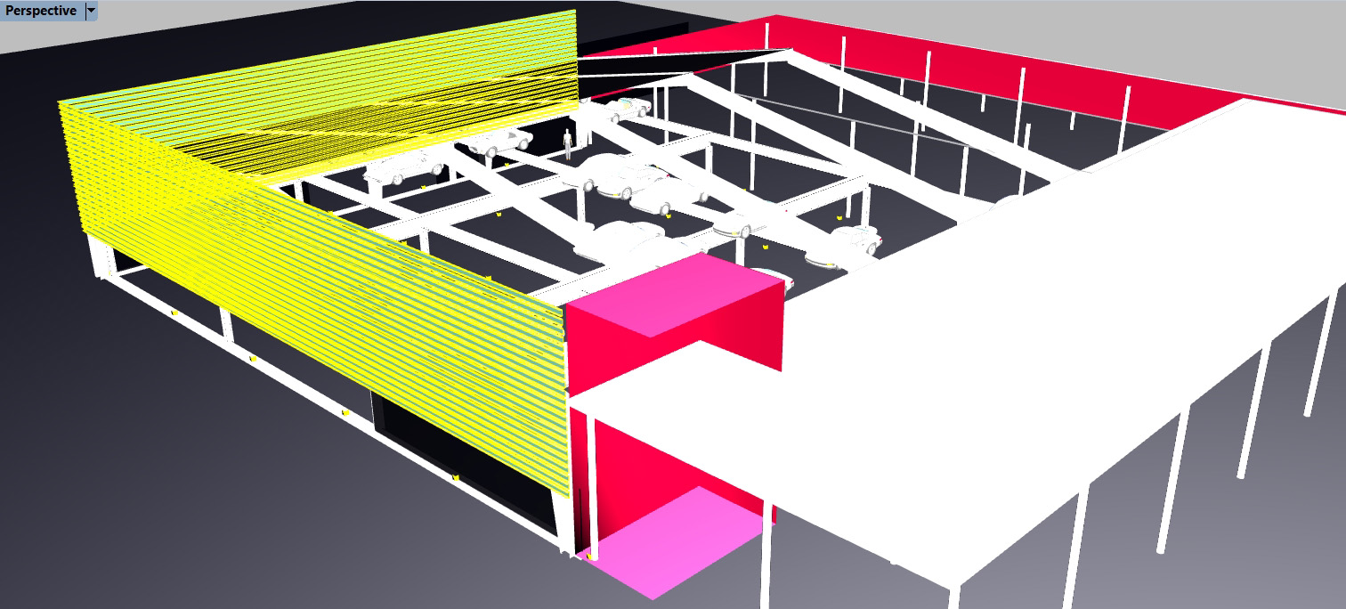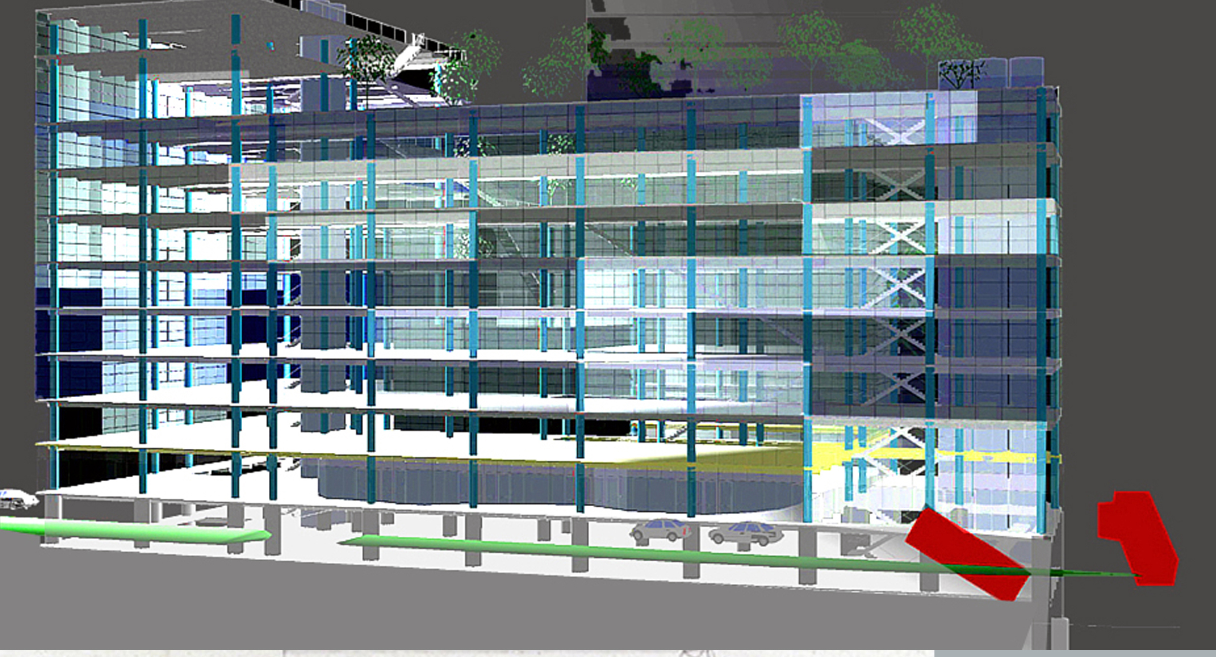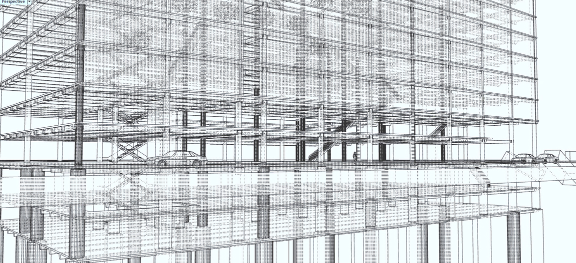 Golz Motors. Building over Building. Deerfield, Illinois. 2008-10. Cost and Space efficient architectural proposal to exploit capital potential of site, by expanding current luxury automobile enterprise up and over former masonry printing plant. Separate custom 100' spanning warrent truss designs, designed by Thornton Tomasetti SE, Chicago. bearing precast hollow core concrete planking to bear 40 automobiles. Alternate structural studies with simple fixed moment framing.