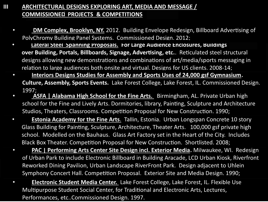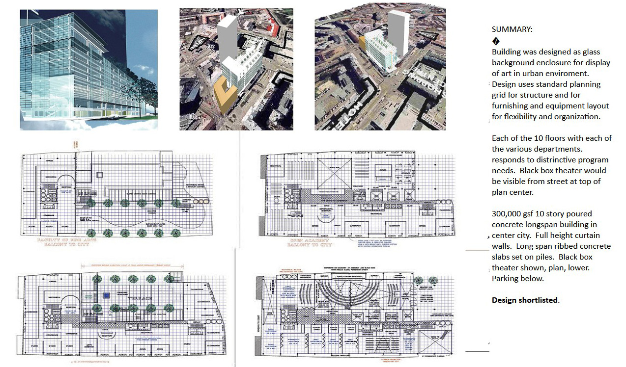 Estonia Academy for the Fine Arts. Tallin, Estonia. New 100,000 ten story long span concrete School for the Arts. In the model of the Glass Art Factory, Bauhaus, 1931-5. Urban Longspan Concrete 10 story Glass Building for Painting, Sculpture, Architecture, Theater Arts. Glass Art Factory set in the Heart of the City. Building as Billboard Building as Message. Pivotal Role of Artistic and Media Narrative in Culture. Includes Black Box Theater. Competition Proposal for New Construction. Shortlisted. 2008 ;