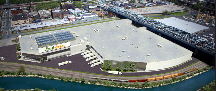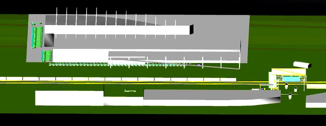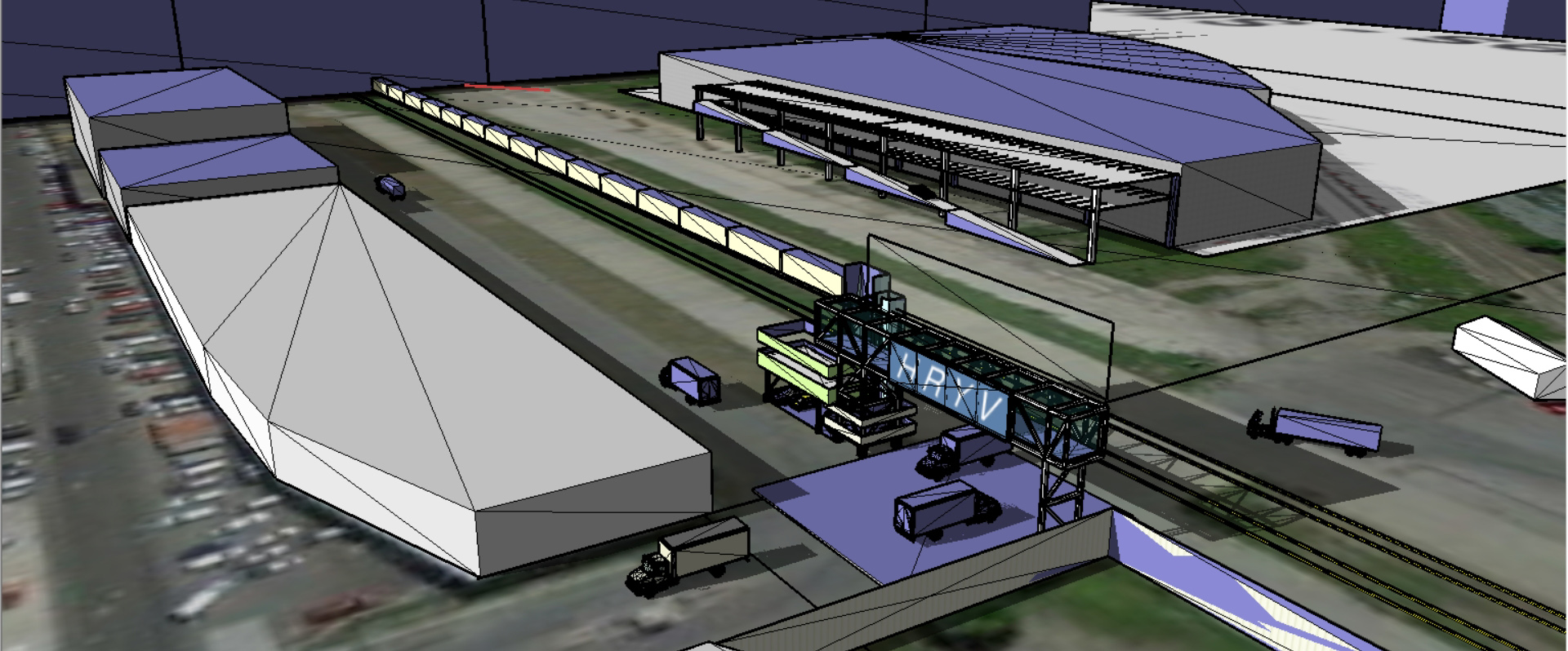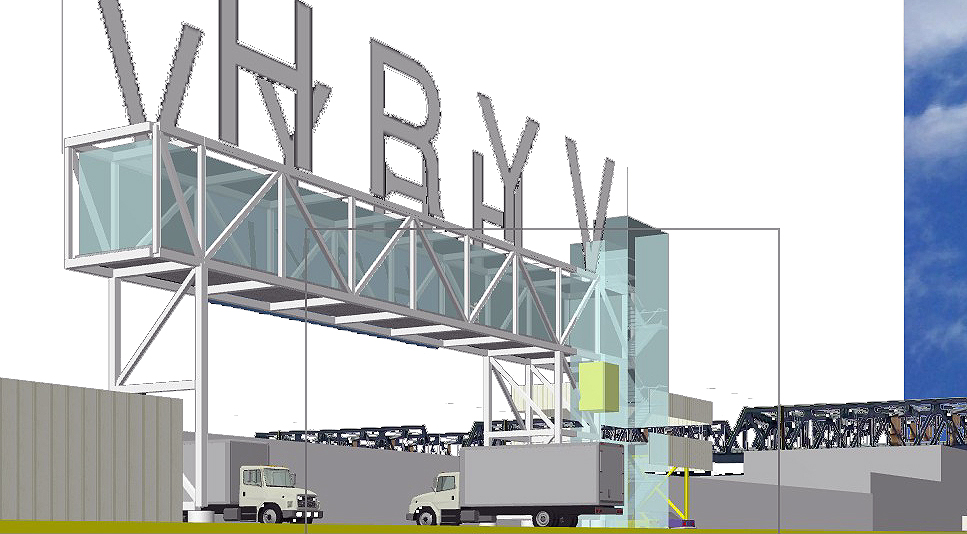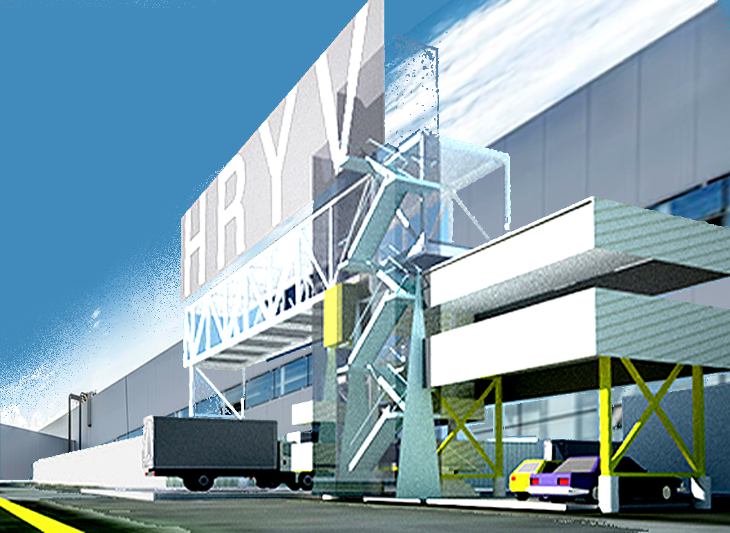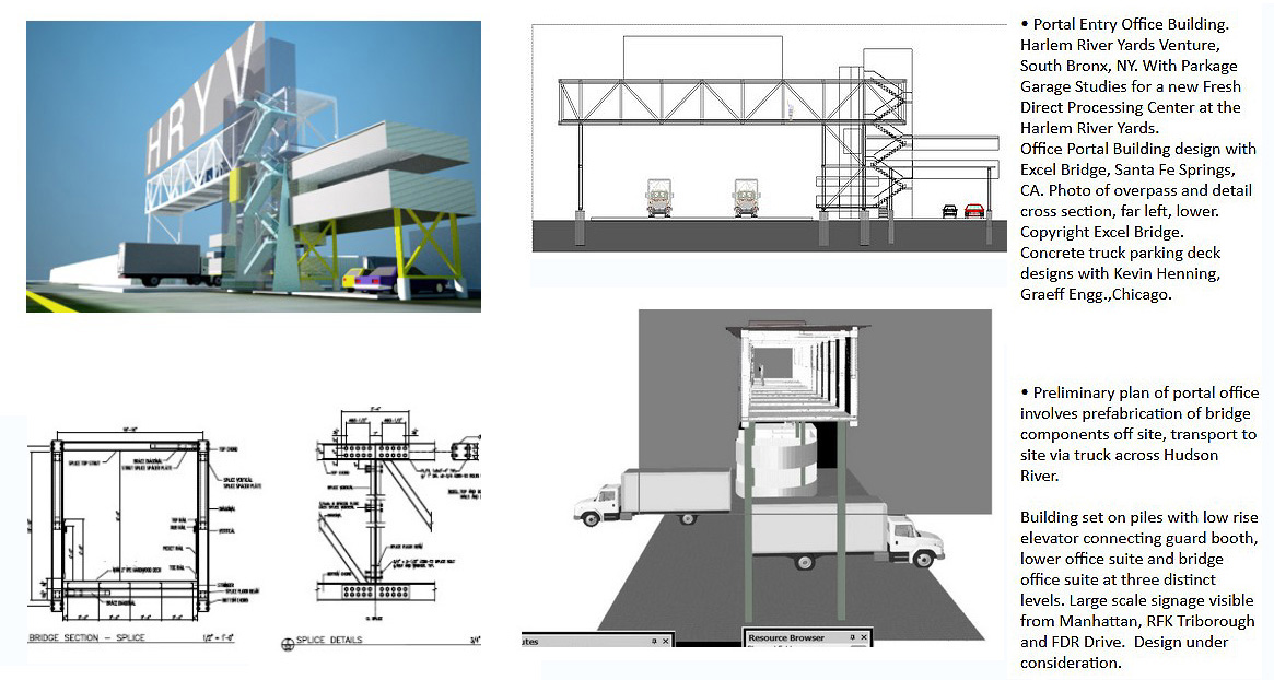 Harlem River Yards Venture, South Bronx, NY. Office and Spanning Portal Building. Entry Advertising and Entry Building to South Bronx, NYC Industrial Yard, including currently Fresh Direct Distribution and Fed Ex. Adjacent to the RFK Bridge over the East River. Prefab bridge design, from Excel Bridge, San Mateo, CA, presented here as office and entry control building for the entire riverfront complex. Prefab tube brought in intact from CA across the George washington Bridge. 2012-14.