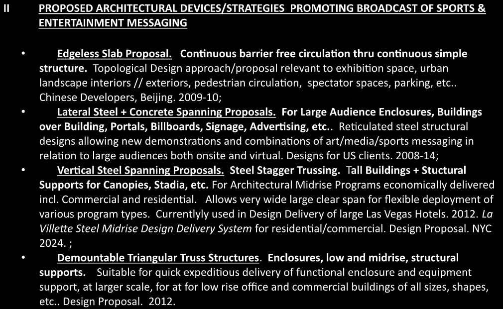 Lateral Steel Spanning Proposals. For Large Audience Enclosure, Buildings over Building, Portals, Billboards, etc.. Reticulated steel structural designs allowing new demonstrations and combinations of art/media/sports messaging in relation to large audiences both onsite and virtual. Designs for US clients. 2008-14;