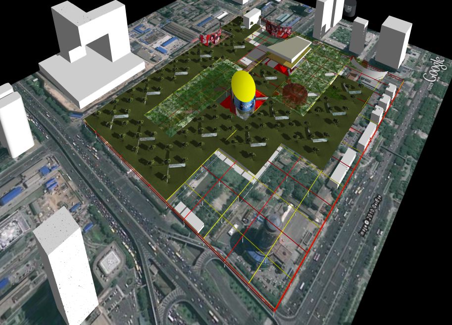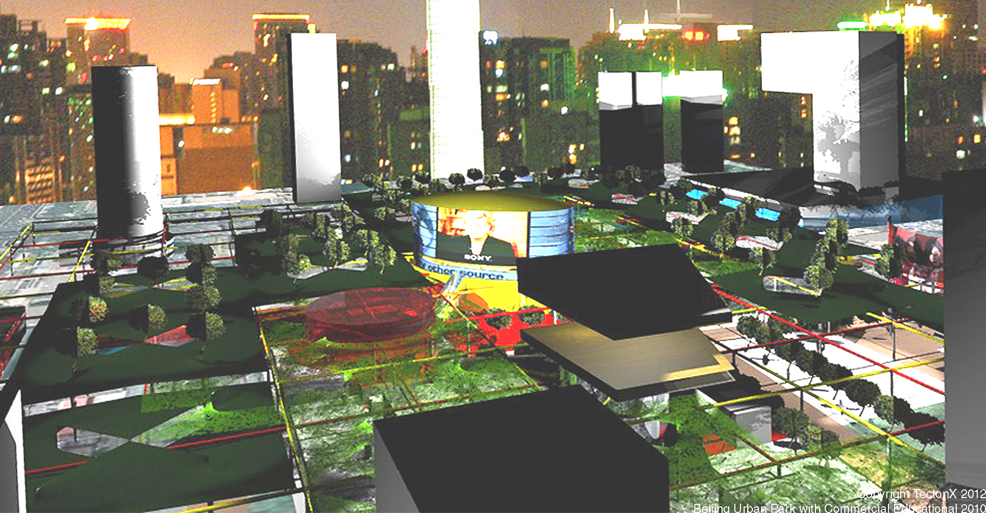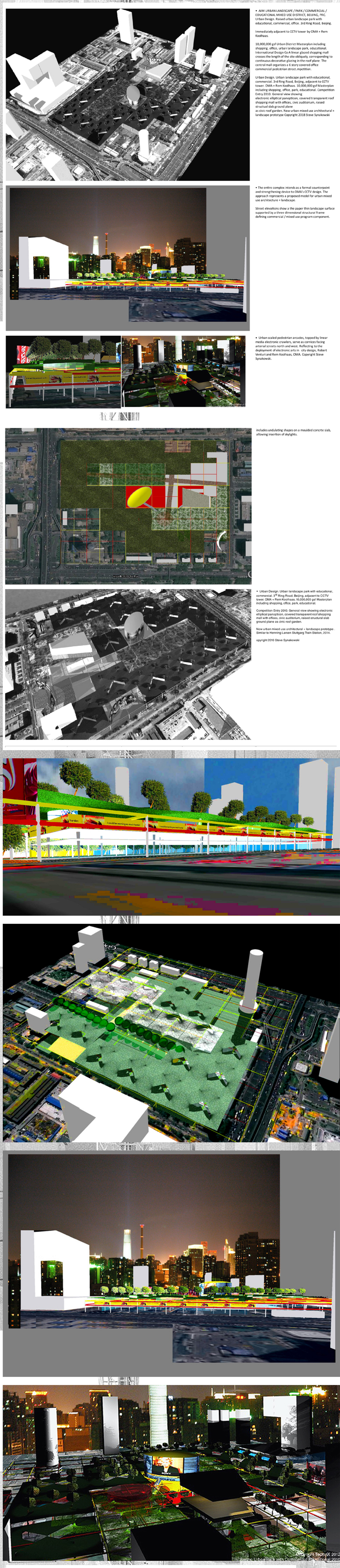 AIM Arts and Cultural Complex, Fifth Ring Road, Beijing, China. Integration of Art//Media as Large Scale Urban Building/Landsape. Art //Media in the Urban Landscape, Art//Media as the Urban Landscape, Dynamic Electronic Message. Lighting, Color and Narrative. 10,000,000 gsf combined media generated urban landscape park whose programmatic origin was inspired by AIM Chinese National Arts School, the design proposal formally centered on Urban Scale cylindrial elliptical rolling billboard. Surrounding undulating slab as shaped surface for extensive greensward urban park, being a modern version of traditional at grade European city parks, as a large scale landscaped setting for urban social engagement and learning. Includes Lincoln Center like urban scale theater above, AIM arts and cultural school, as well as extensive shopping and office along glass covered atrium. Directly opposite Rem Koolhaas' OMA CCTV center, which it directly complements in form. 2008-9. Competition Proposal.