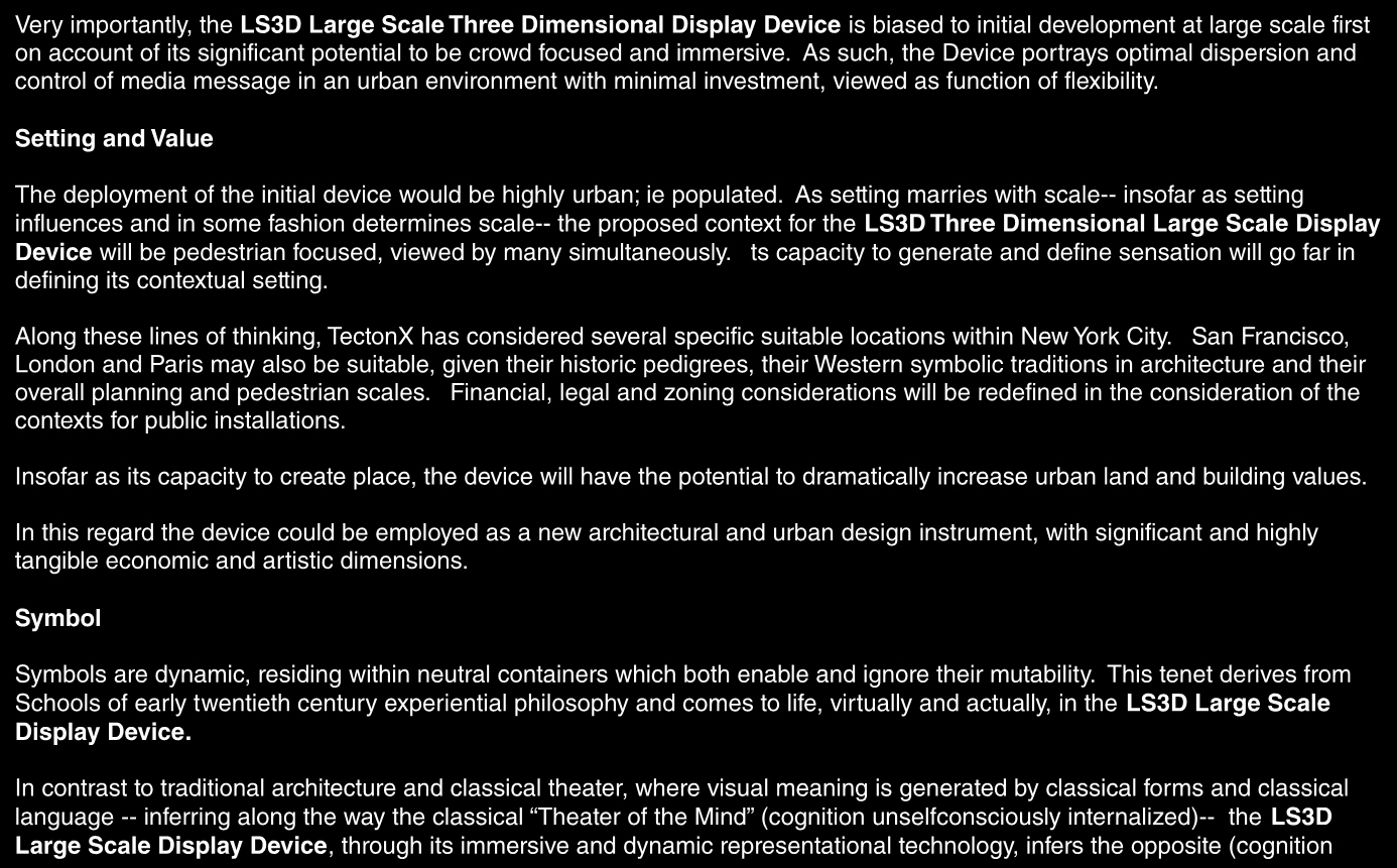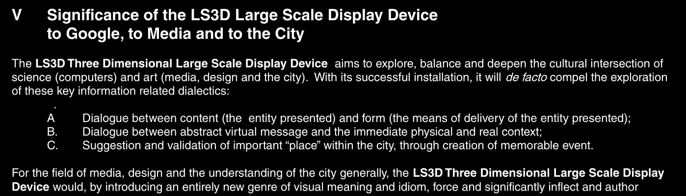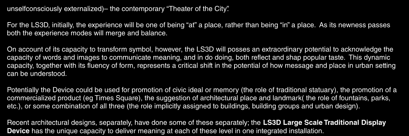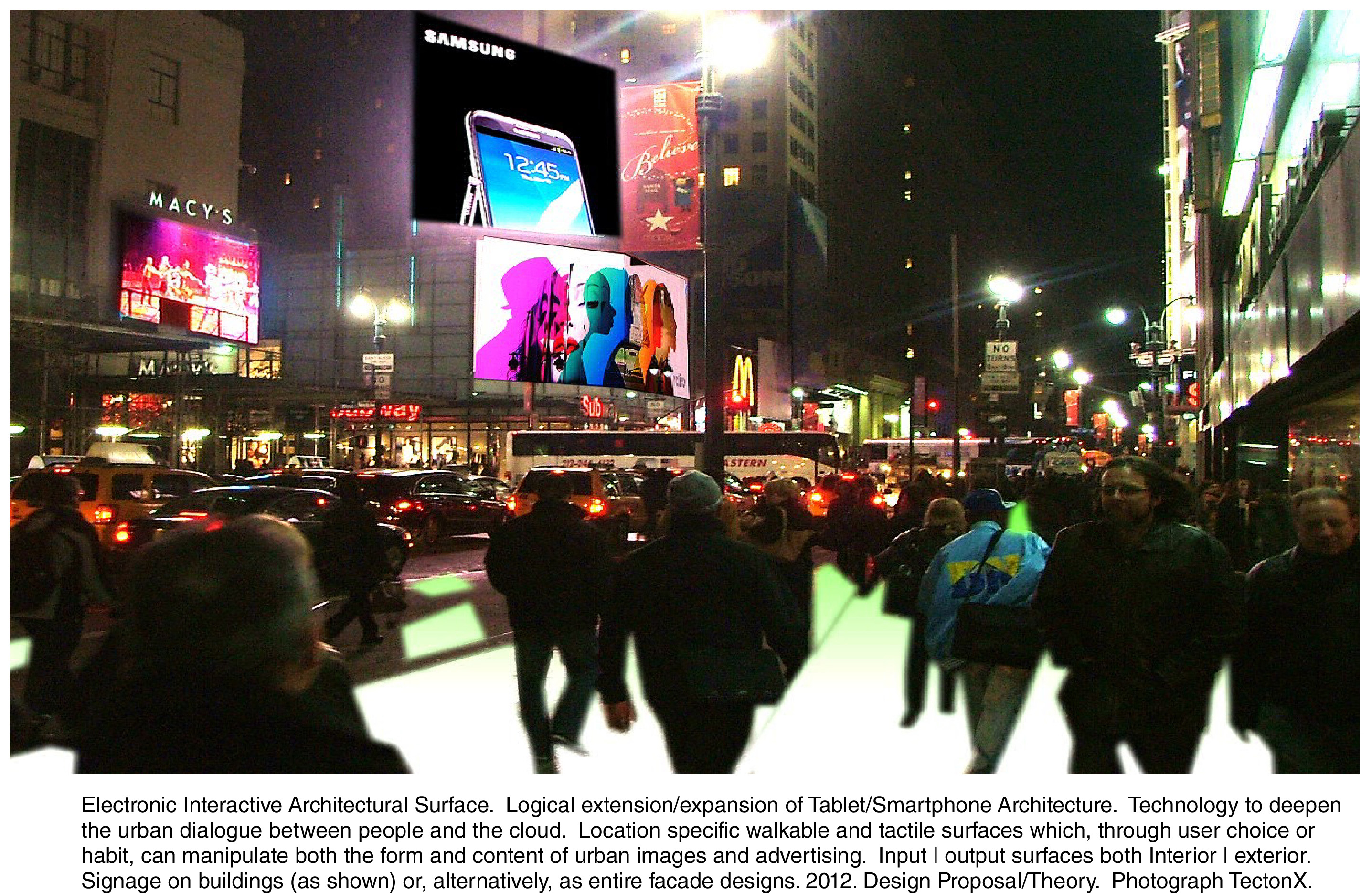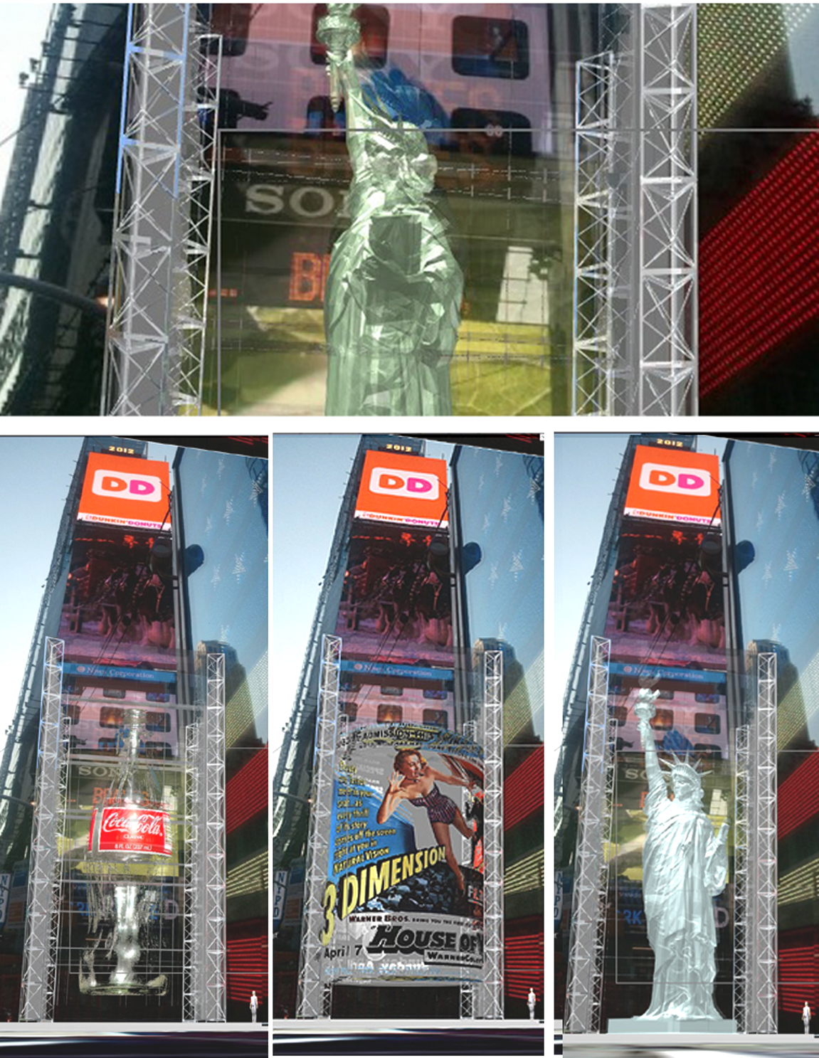 3D Dynamic Media Projection as A Proposed New Building Type in Urban Design. How Media Shapes Behavior in Urban Context.Expansion of the urban art/media narrative through the deployment of cinematic moving 3D life size holistic images and stories into traditional urban space. Design proposal to Google for a 3D billboard for Times Square, 2012;