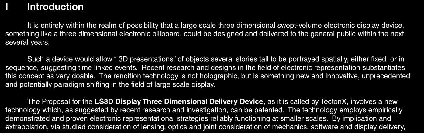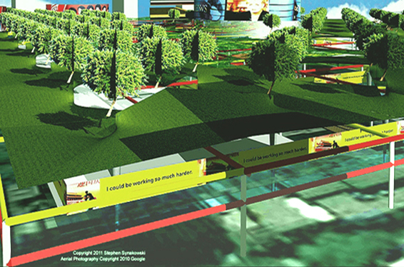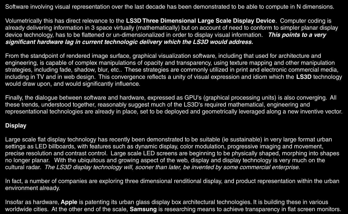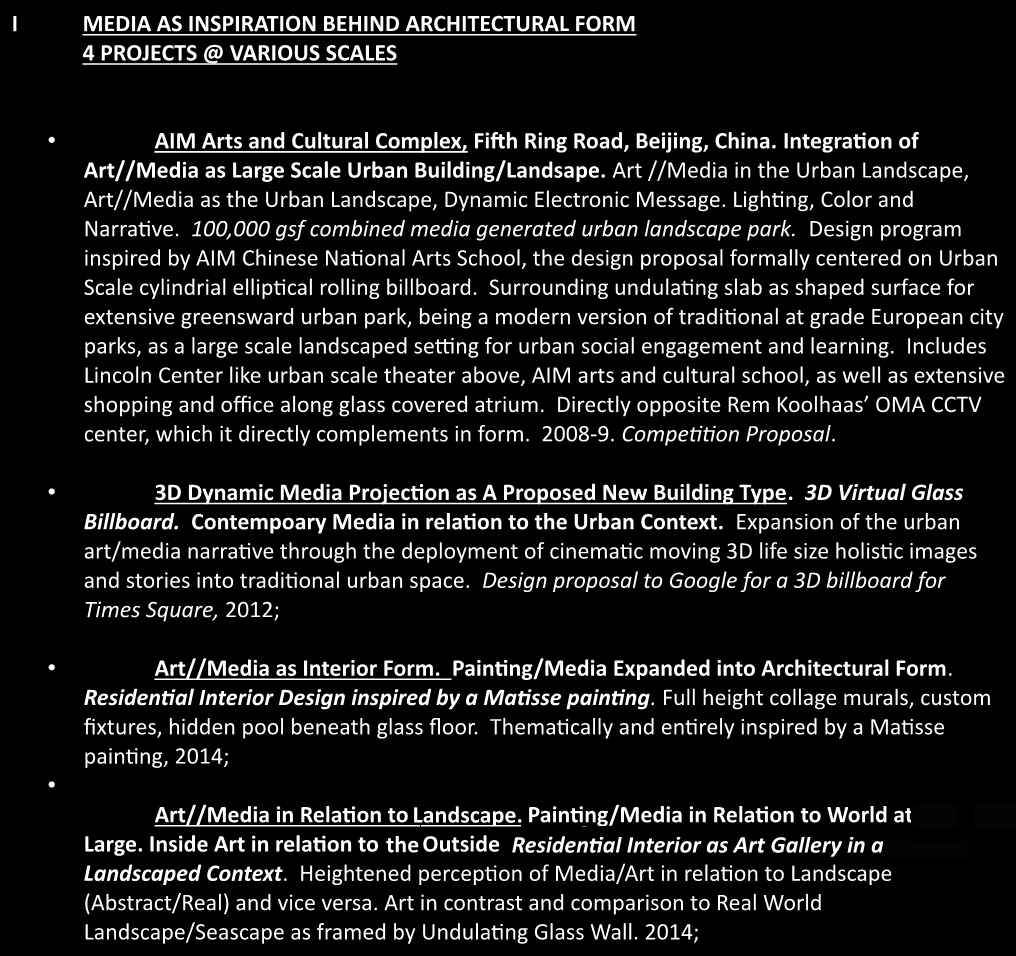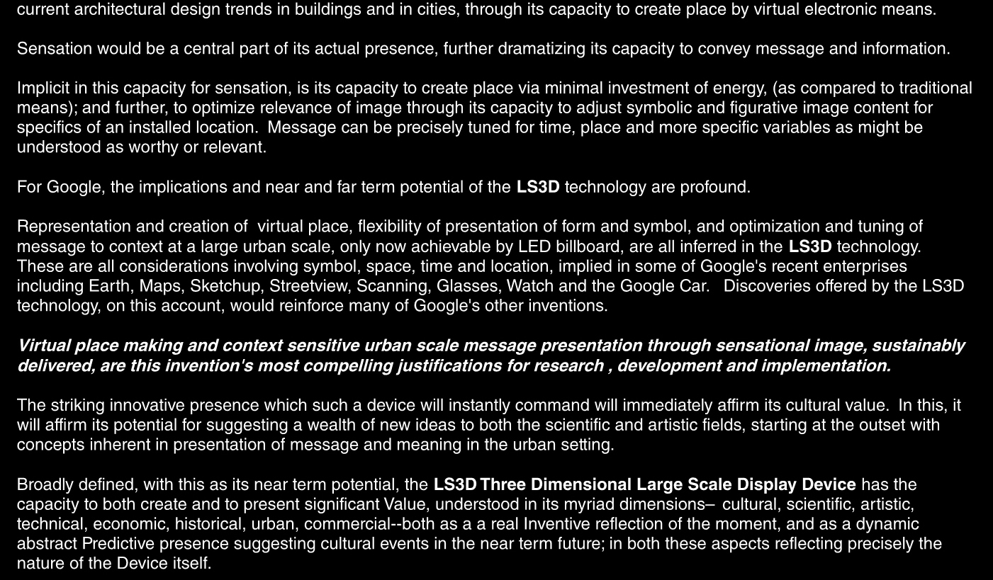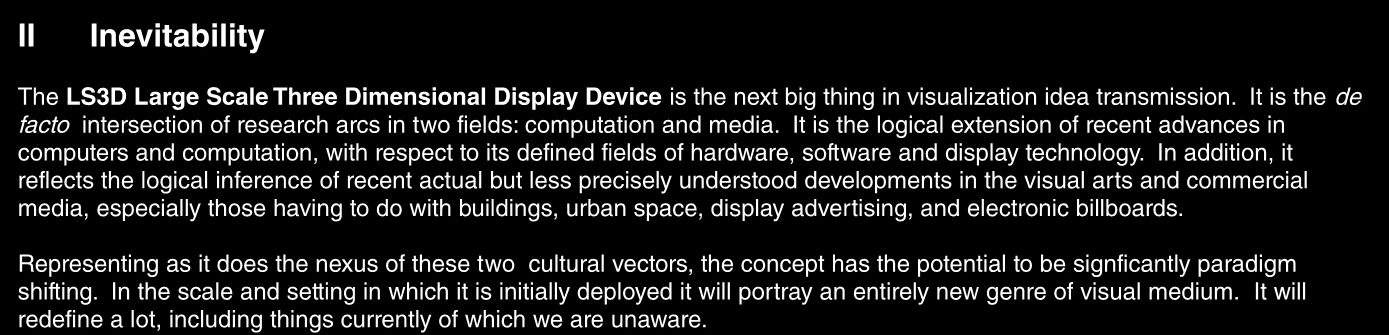 3D Dynamic Media Projection as A Proposed New Building Type in Urban Design. How Media Shapes Behavior in Urban Context.Expansion of the urban art/media narrative through the deployment of cinematic moving 3D life size holistic images and stories into traditional urban space. Design proposal to Google for a 3D billboard for Times Square, 2012;