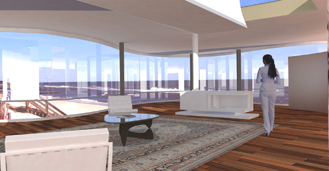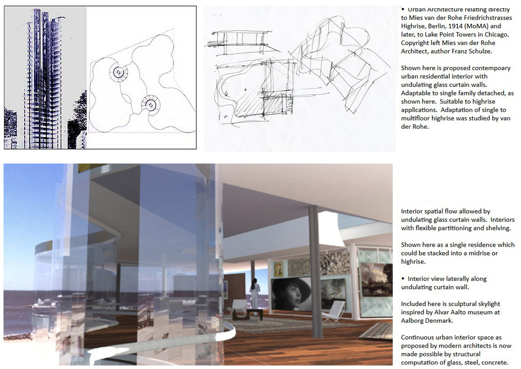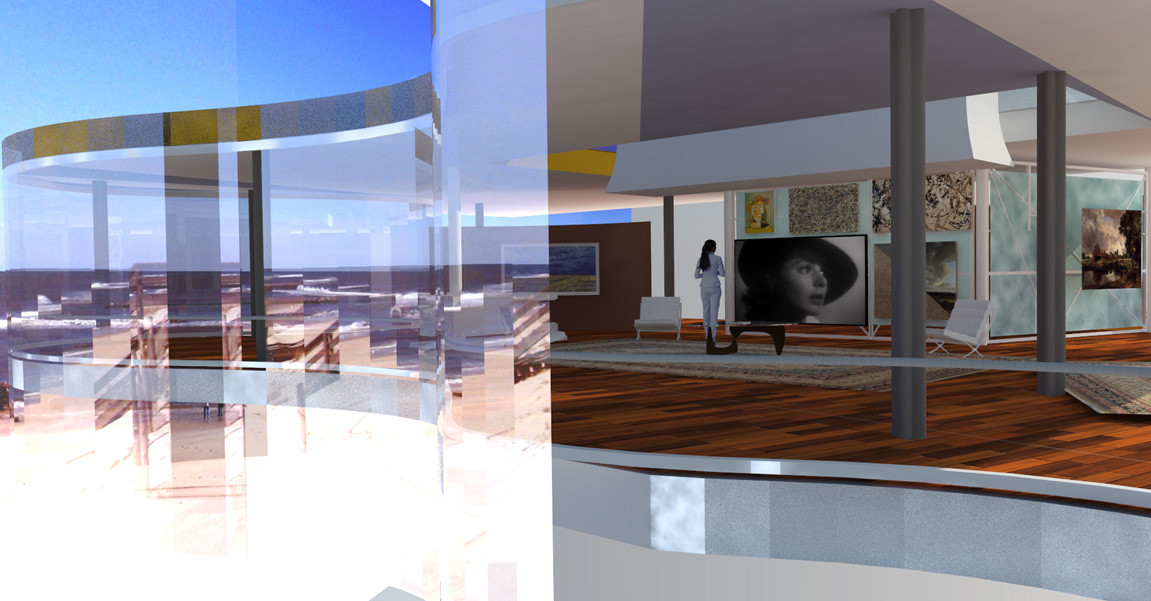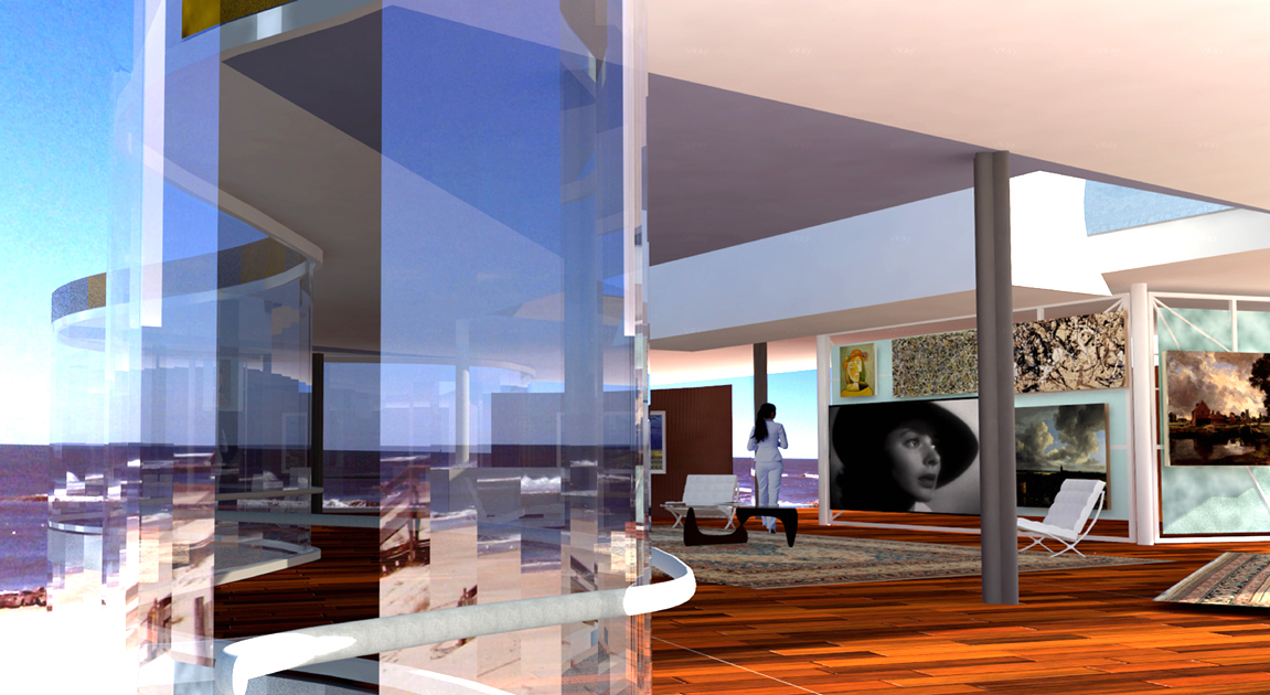 Art//Media in Relation to the Outside World. Painting/Media as Shaped by and through Architectural Form. Painting/Media in Relation to World at Large. Inside Art in relation to Outside Landscape.Residential Interior Design with Full Height Undulated Glass View to Landscape. Heightend perception of Media/Art in relation to Landscape (Abstract/Real) and vice versa. Art in contrast and comparison to Real World Landscape/Seascape as framed by Undulating Glass Wall. 2014;