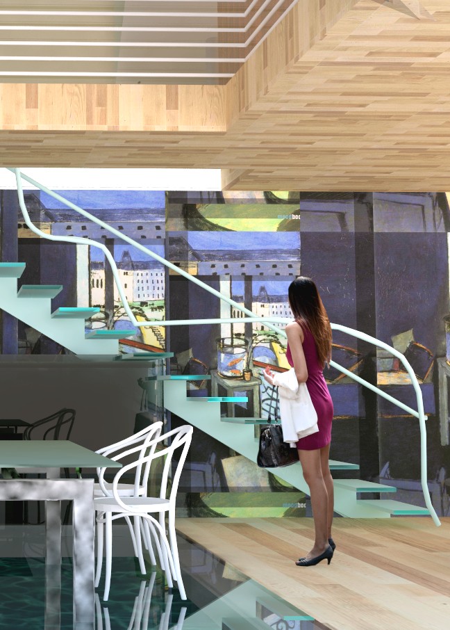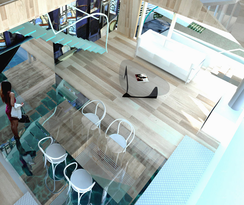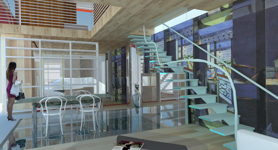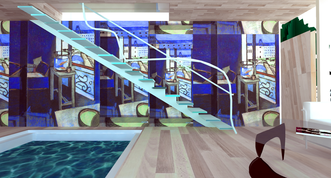 Art//Media as Interior. Art//Media as Design Generator. Painting/Media Expanded into Architectural Form. Residential Interior Design for a Modern Art Lover. Full height collage murals, custom fixtures, hidden pool beneath glass floor. Thematically and entirely inspired by a Matisse painting, 2014;