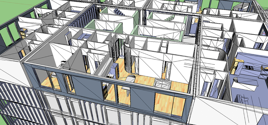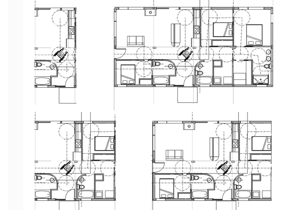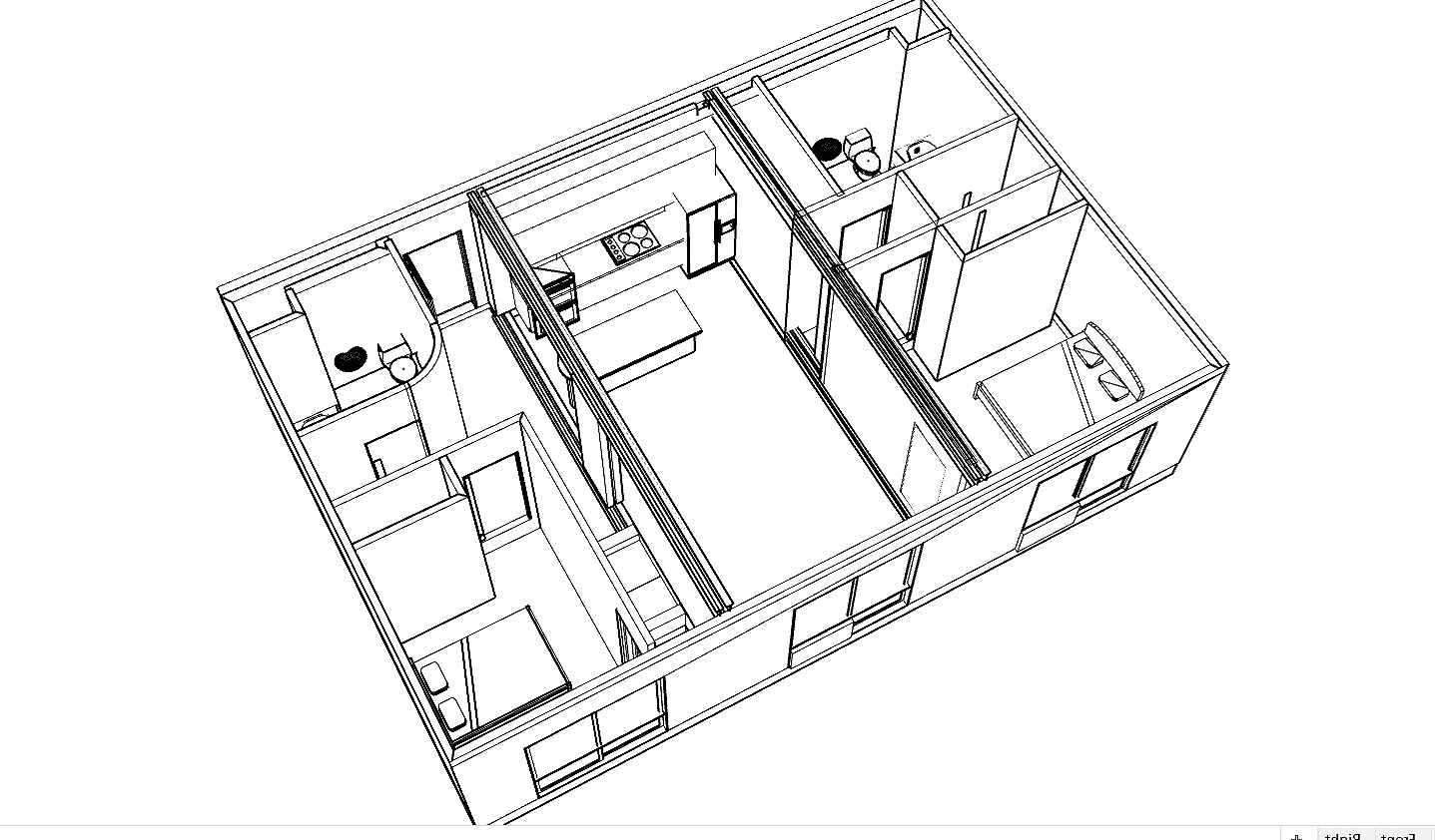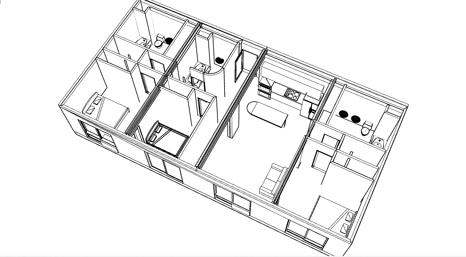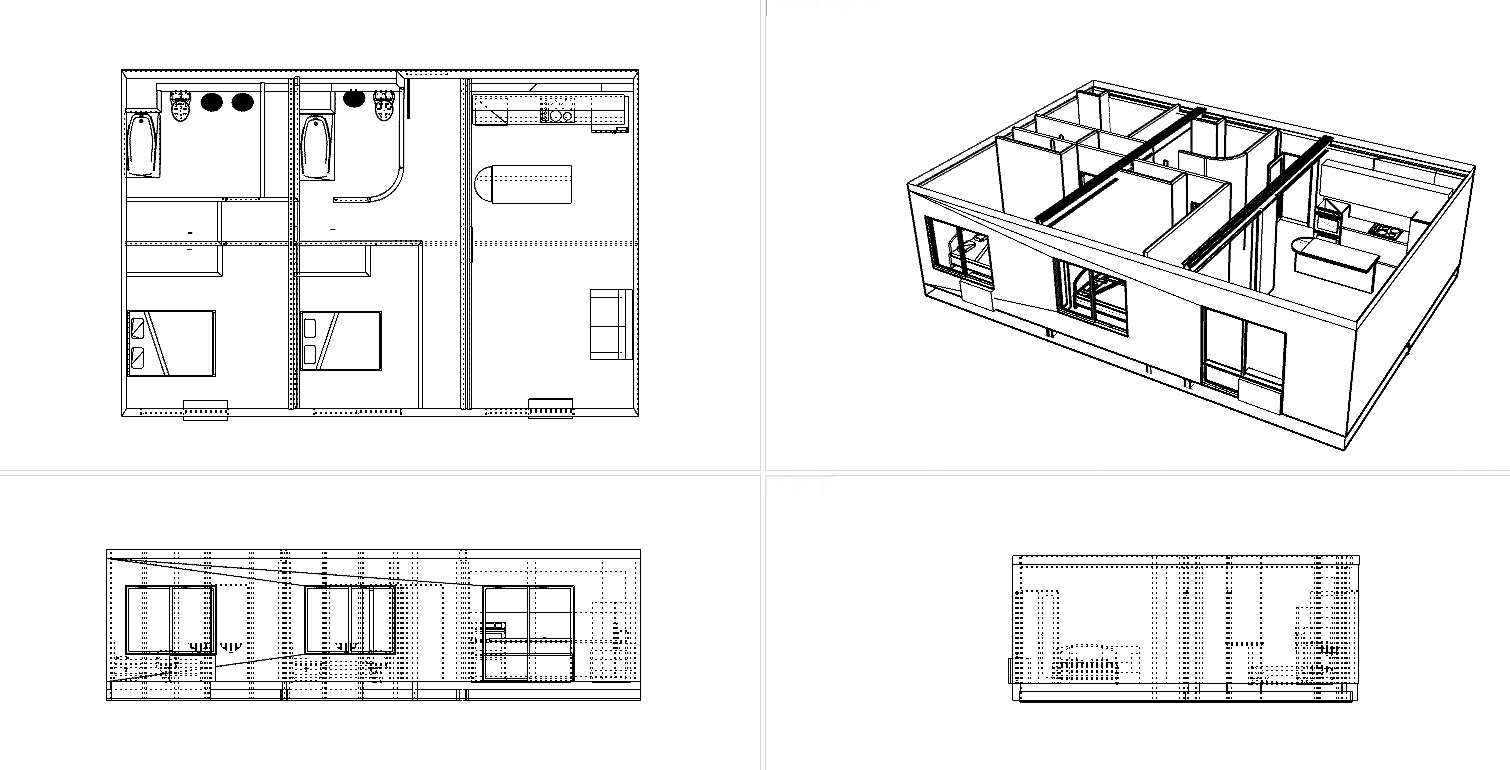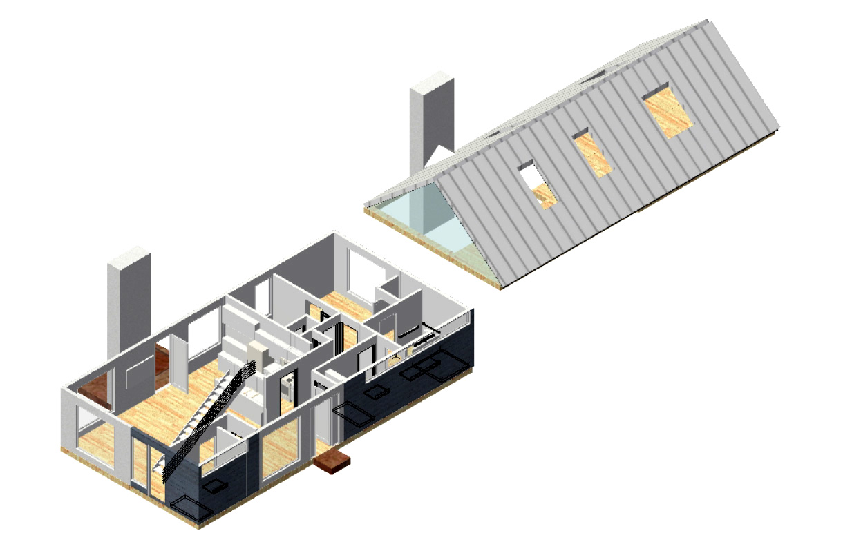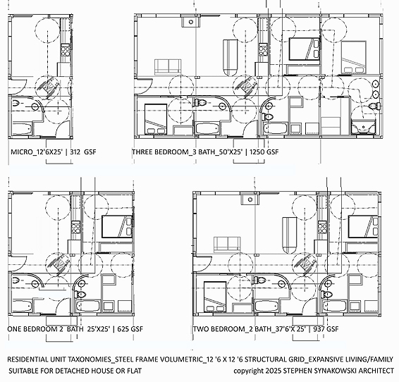 All panel designs premised, incl.braced core, corridor, townhome flats, and house, based on a standard 1250 gsf 3 bed residential house plan. All units demisable from full 3br to 1/2 br to studio to micro units, for all scales of assembly.