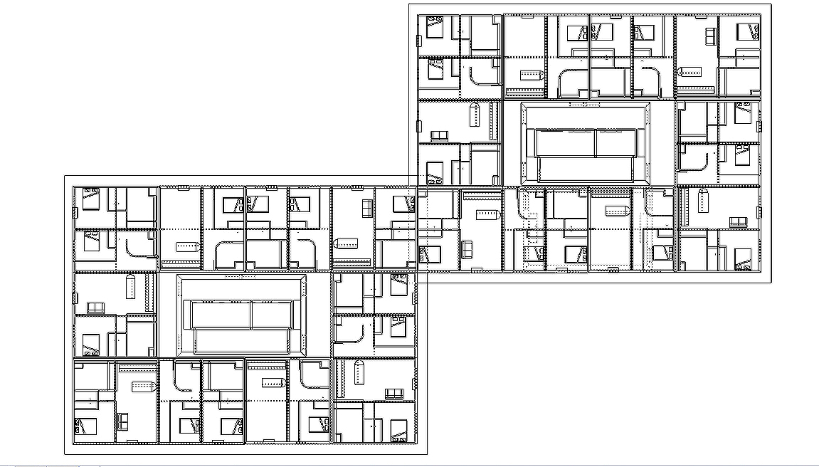 Twinned Low or Midrise Blocks. Allows Shared Commons for Senior Residential Living or Dormitories.